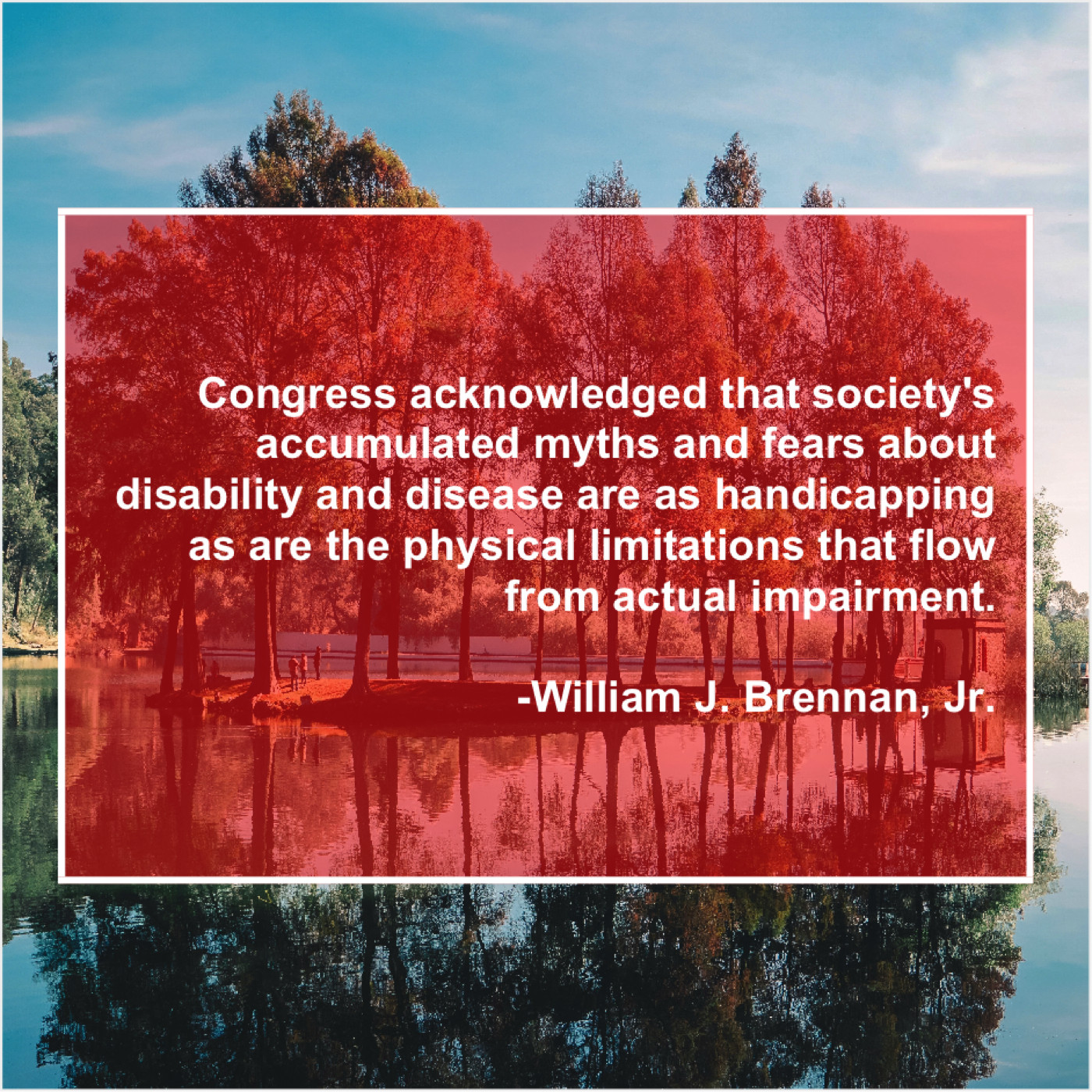 William J. Brennan, Jr. William J. Brennan, Jr. – Congress acknowledged that society’s accumulated… March 13, 2019 admin “Congress acknowledged that society’s accumulated myths and fears about disability and disease are as handicapping as are the physical limitations that flow from actual impairment.”-William J. Brennan, Jr.