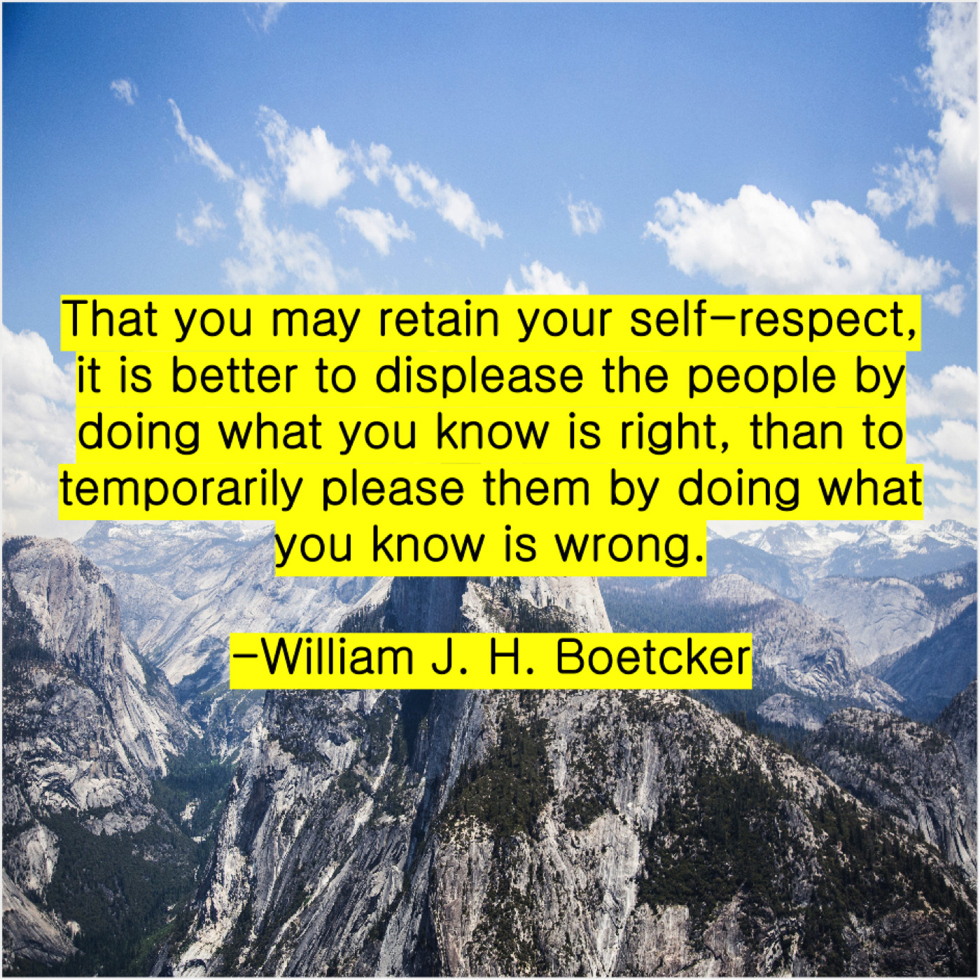 William J. H. Boetcker William J. H. Boetcker – That you may retain your… June 18, 2019 admin “That you may retain your self-respect, it is better to displease the people by doing what you know is right, than to temporarily please them by doing what you know is wrong.”-William J. H. Boetcker