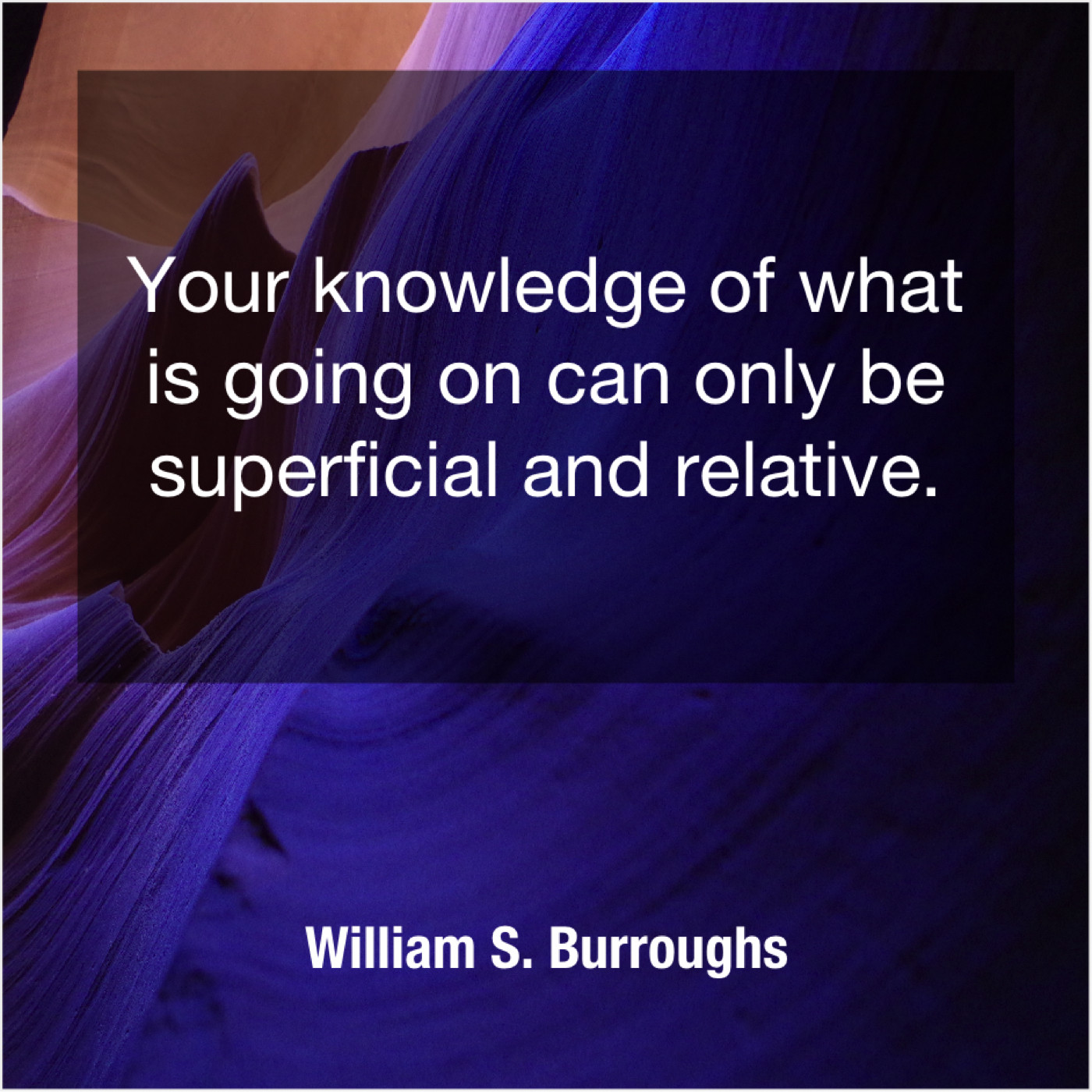 William S. Burroughs William S. Burroughs – Your knowledge of what is… May 4, 2019 admin “Your knowledge of what is going on can only be superficial and relative.”-William S. Burroughs