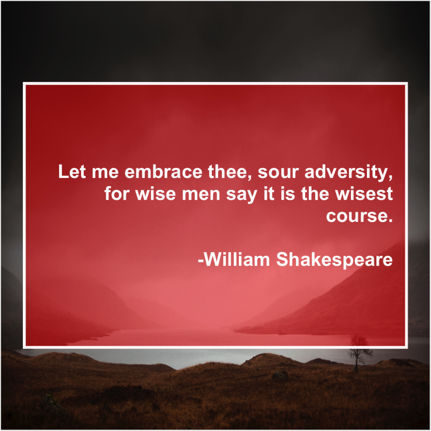 William Shakespeare William Shakespeare – Let me embrace thee, sour… March 4, 2019 admin “Let me embrace thee, sour adversity, for wise men say it is the wisest course.”-William Shakespeare