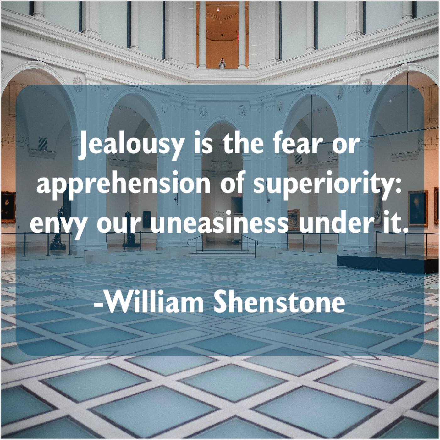 William Shenstone William Shenstone – Jealousy is the fear or… September 11, 2019 admin “Jealousy is the fear or apprehension of superiority: envy our uneasiness under it.”-William Shenstone