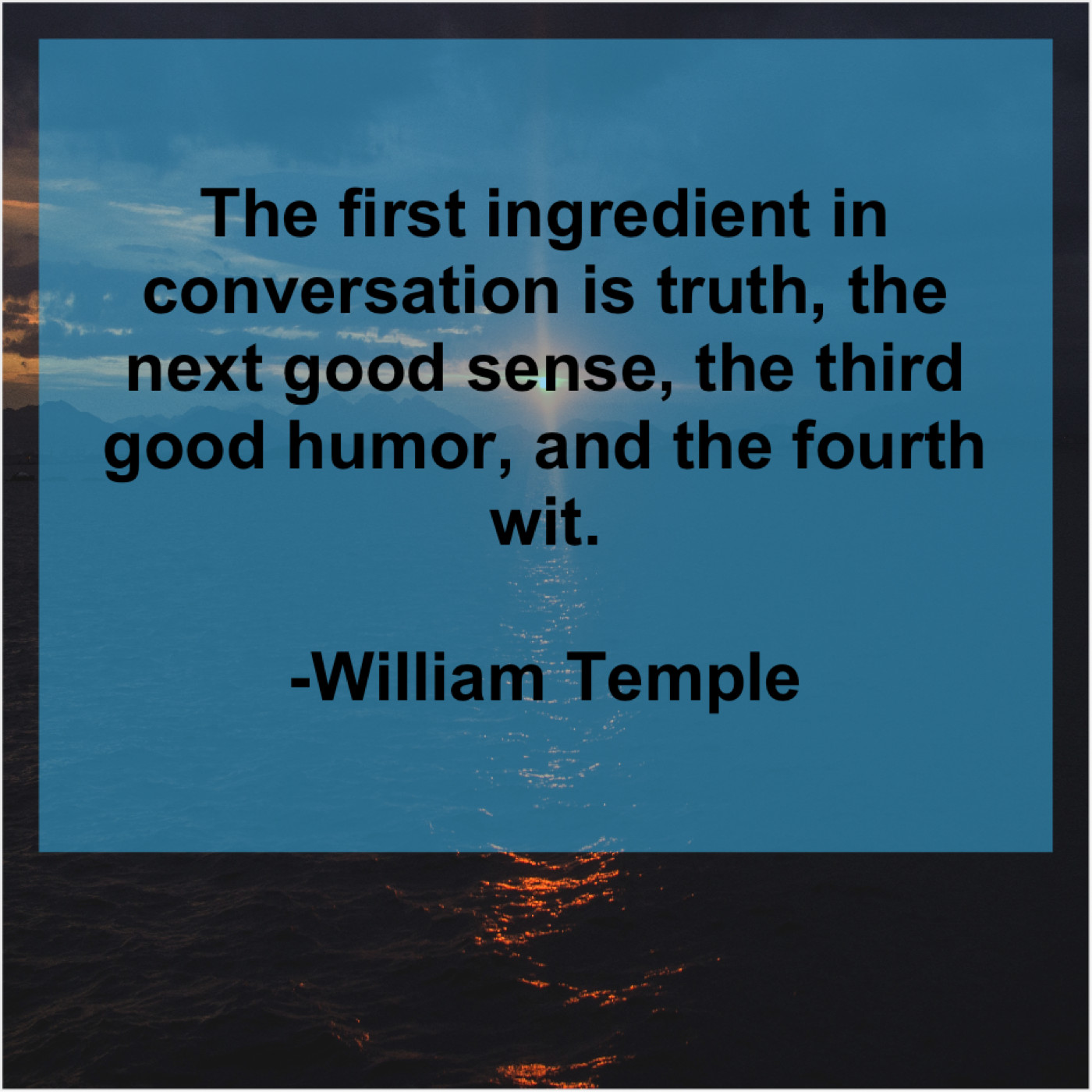 William Temple William Temple – The first ingredient in conversation… July 21, 2019 admin “The first ingredient in conversation is truth, the next good sense, the third good humor, and the fourth wit.”-William Temple
