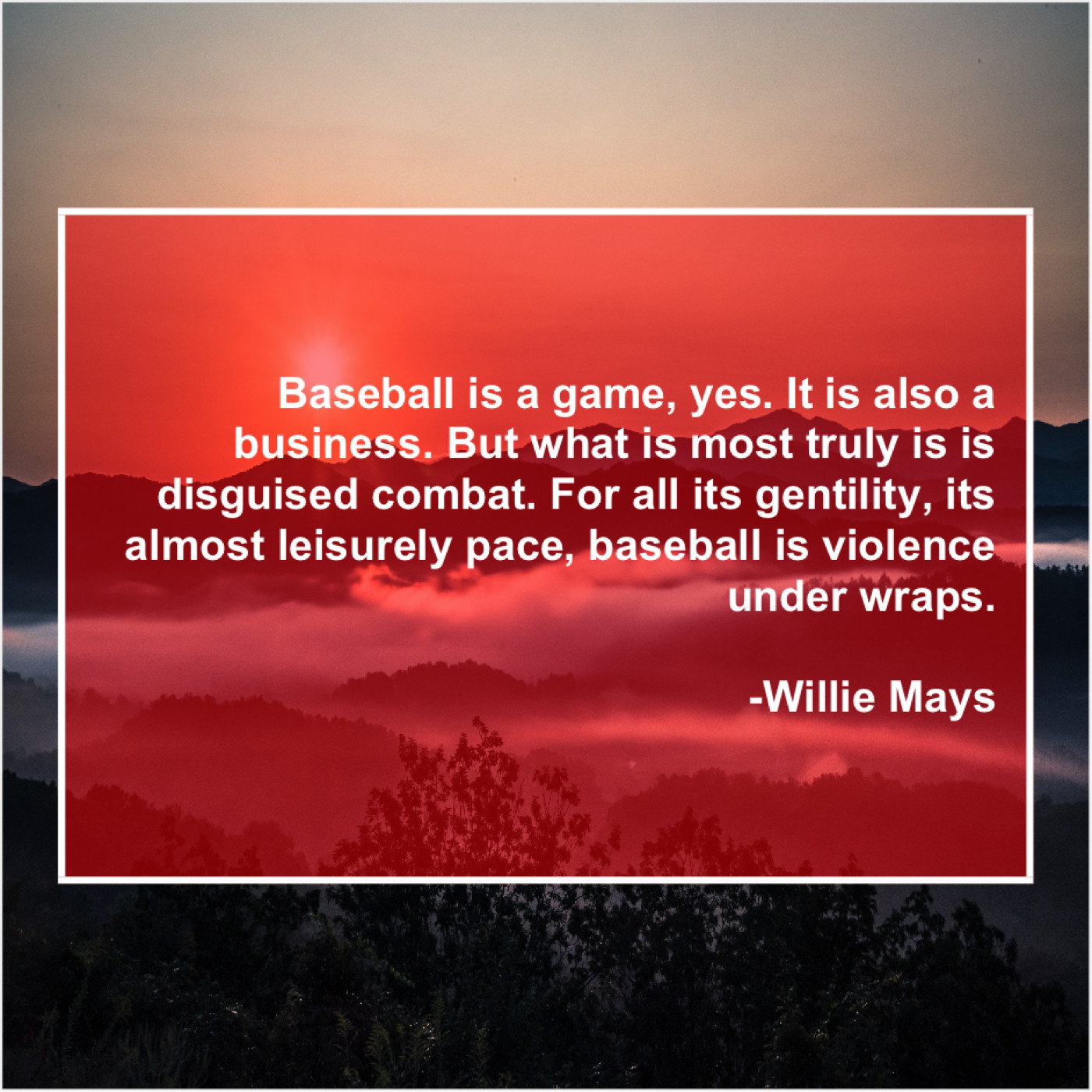 Willie Mays Willie Mays – Baseball is a game, yes… June 2, 2019 admin “Baseball is a game, yes. It is also a business. But what is most truly is is disguised combat. For all its gentility, its almost leisurely pace, baseball is violence under wraps.”-Willie Mays