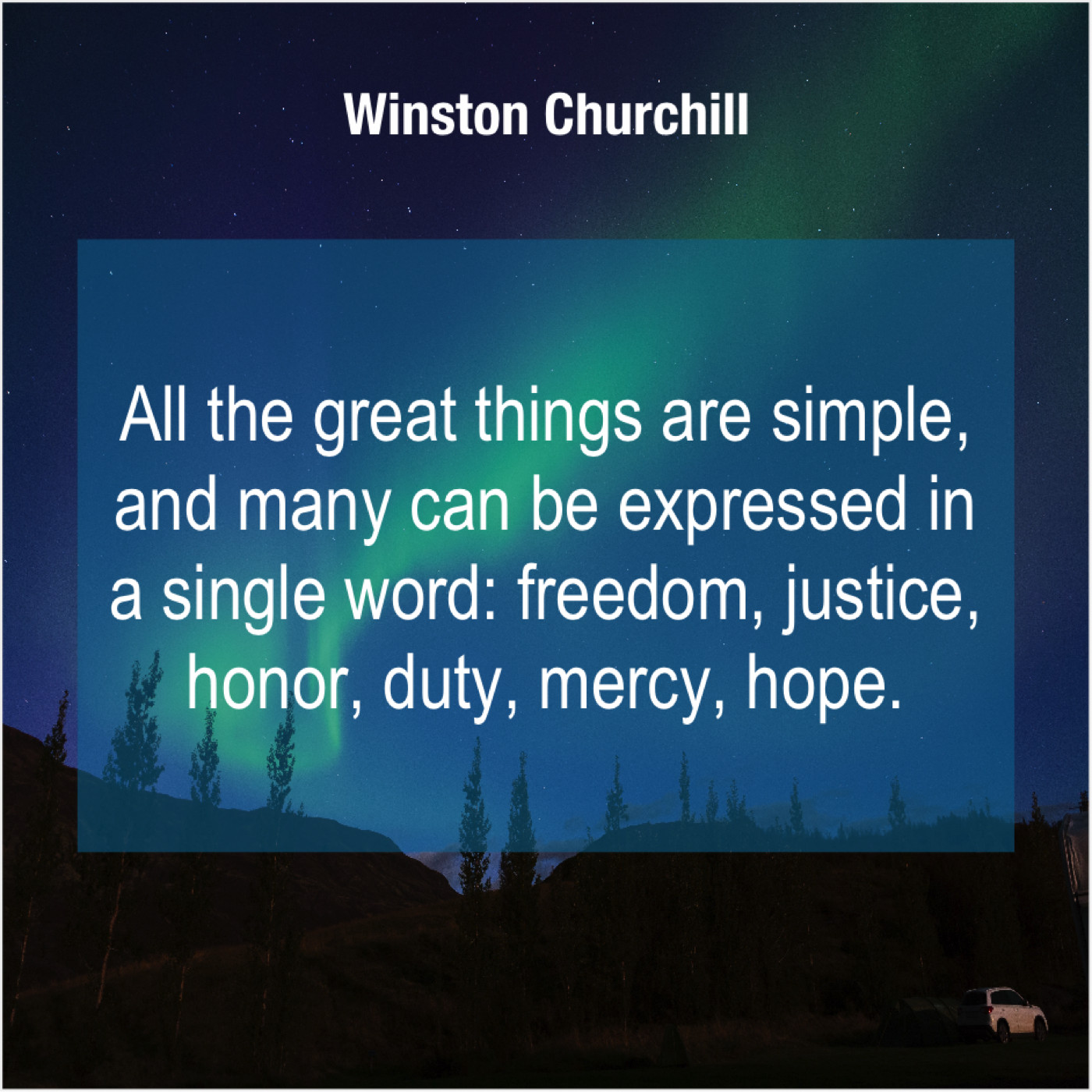 Winston Churchill Winston Churchill – All the great things are… October 4, 2019 admin “All the great things are simple, and many can be expressed in a single word: freedom, justice, honor, duty, mercy, hope.”-Winston Churchill