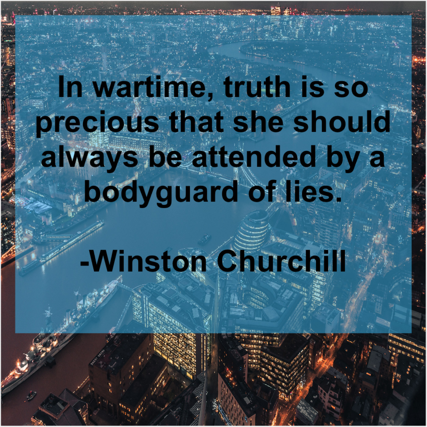 Winston Churchill Winston Churchill – In wartime, truth is so… October 16, 2019 admin “In wartime, truth is so precious that she should always be attended by a bodyguard of lies.”-Winston Churchill