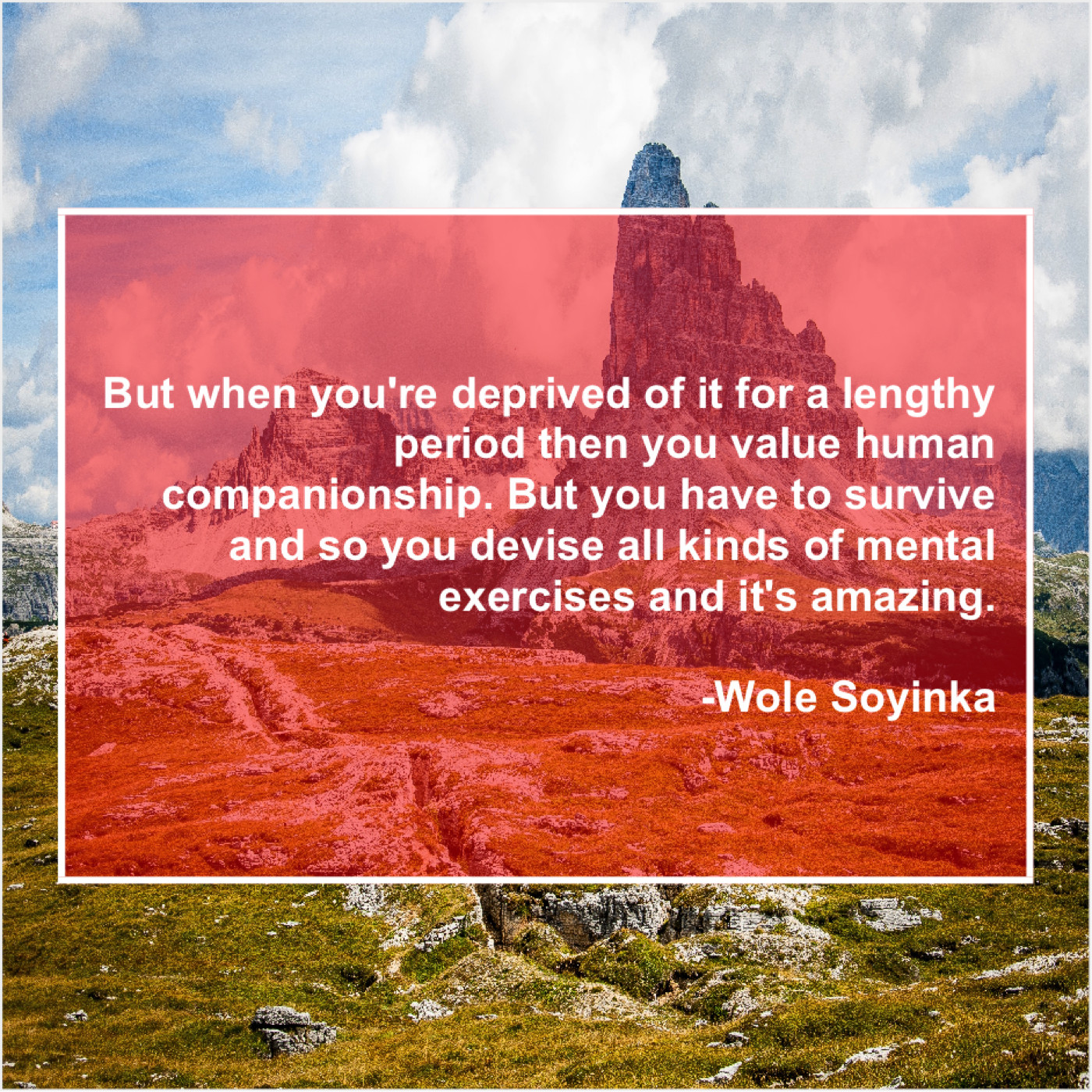 Wole Soyinka Wole Soyinka – But when you’re deprived of… July 9, 2019 admin “But when you’re deprived of it for a lengthy period then you value human companionship. But you have to survive and so you devise all kinds of mental exercises and it’s amazing.”-Wole Soyinka