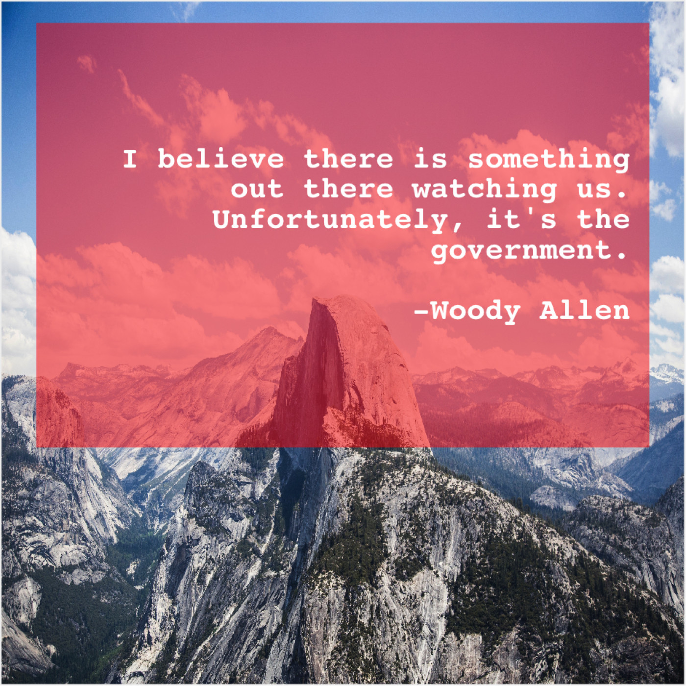 Woody Allen Woody Allen – I believe there is something… June 22, 2019 admin “I believe there is something out there watching us. Unfortunately, it’s the government.”-Woody Allen