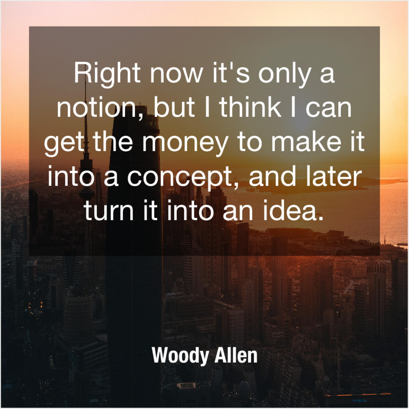 Woody Allen Woody Allen – Right now it’s only a… June 28, 2019 admin “Right now it’s only a notion, but I think I can get the money to make it into a concept, and later turn it into an idea.”-Woody Allen