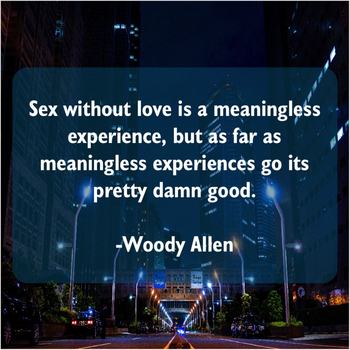 Woody Allen Woody Allen – Sex without love is a… October 1, 2019 admin “Sex without love is a meaningless experience, but as far as meaningless experiences go its pretty damn good.”-Woody Allen