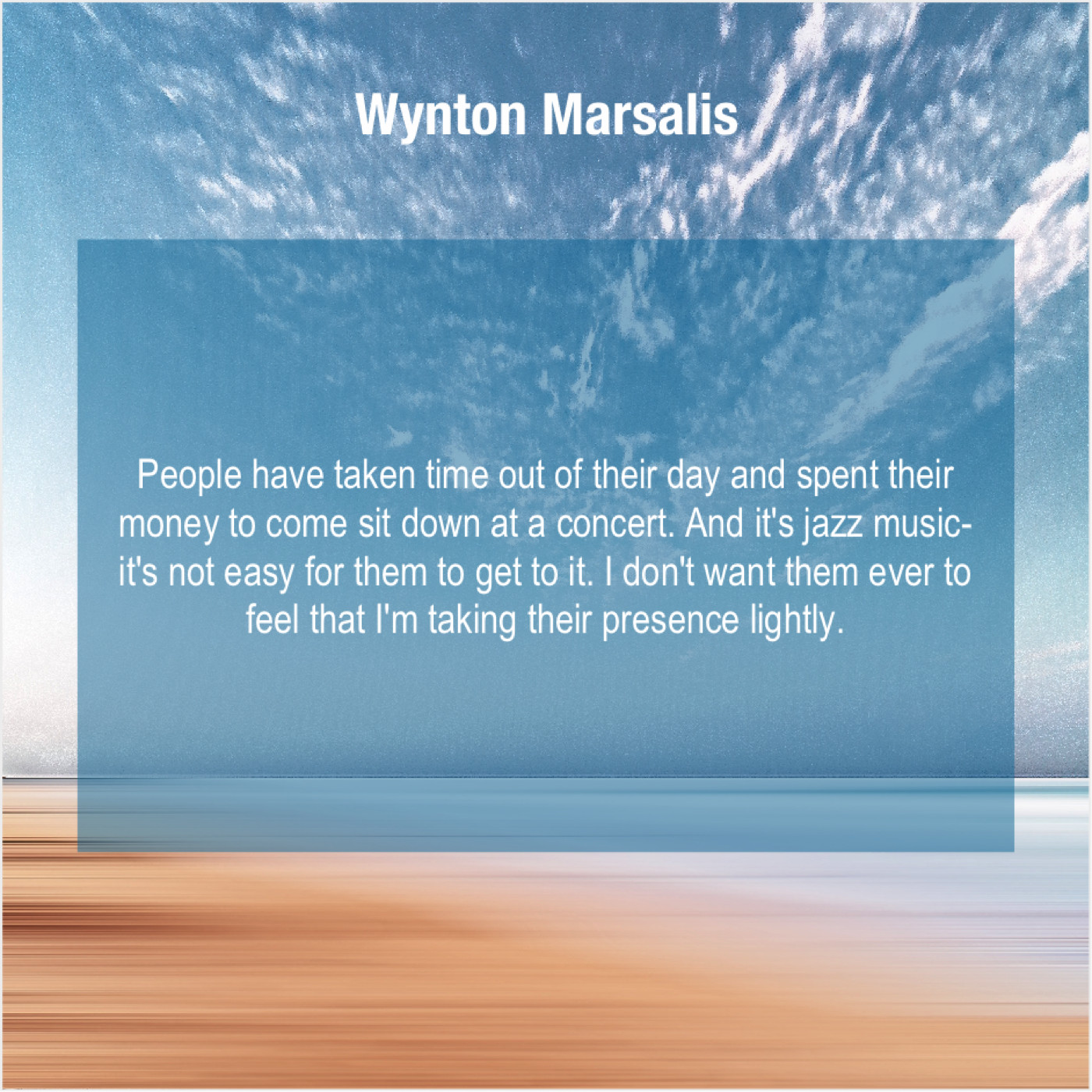 Wynton Marsalis Wynton Marsalis – People have taken time out… January 2, 2019 admin “People have taken time out of their day and spent their money to come sit down at a concert. And it’s jazz music-it’s not easy for them to get to it. I don’t want them ever to feel that I’m taking their presence lightly.”-Wynton Marsalis