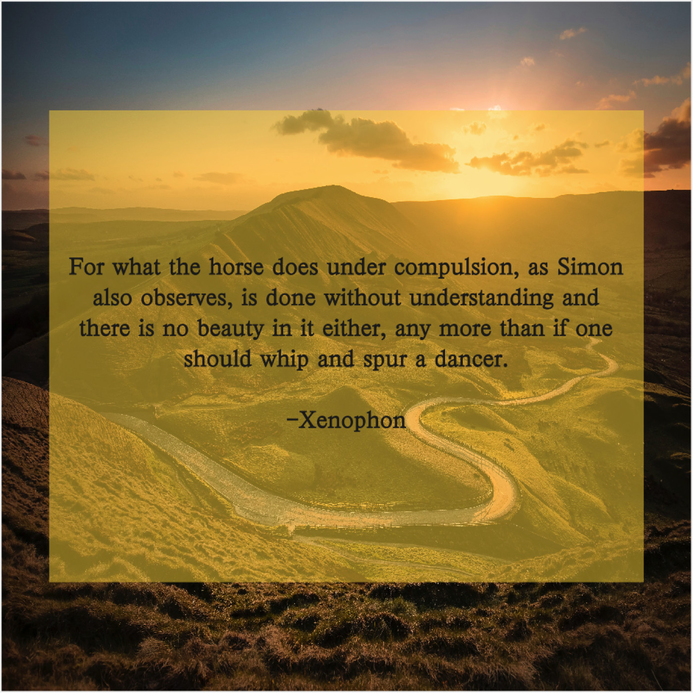 Xenophon Xenophon – For what the horse does… June 13, 2019 admin “For what the horse does under compulsion, as Simon also observes, is done without understanding and there is no beauty in it either, any more than if one should whip and spur a dancer.”-Xenophon