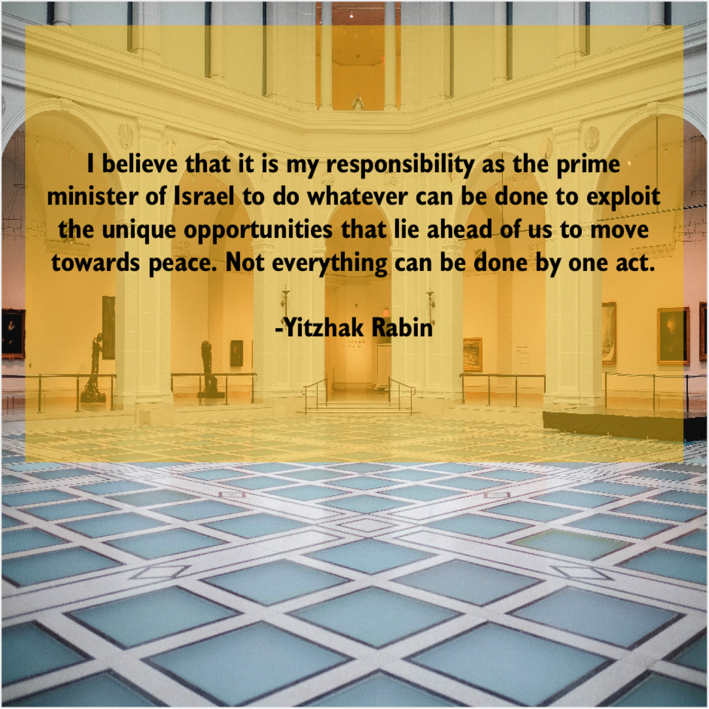 Yitzhak Rabin Yitzhak Rabin – I believe that it is… January 31, 2019 admin “I believe that it is my responsibility as the prime minister of Israel to do whatever can be done to exploit the unique opportunities that lie ahead of us to move towards peace. Not everything can be done by one act.”-Yitzhak Rabin