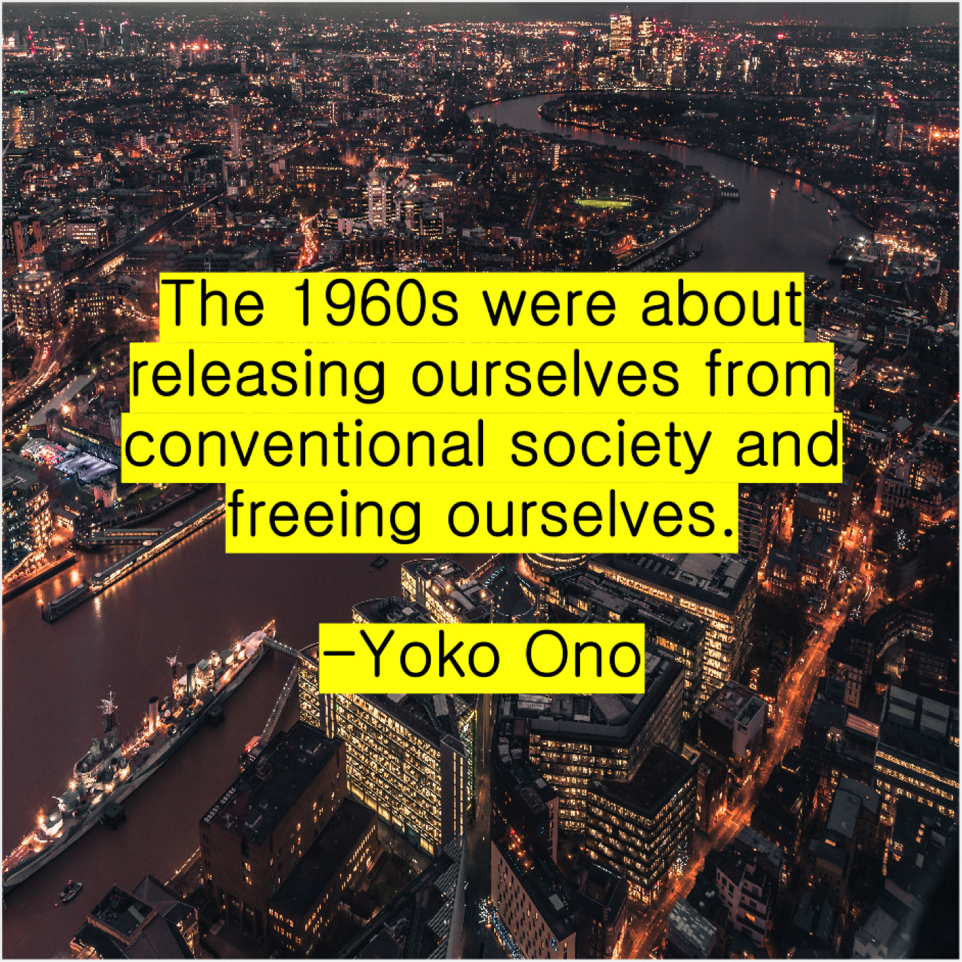 Yoko Ono Yoko Ono – The 1960s were about releasing… June 5, 2019 admin “The 1960s were about releasing ourselves from conventional society and freeing ourselves.”-Yoko Ono