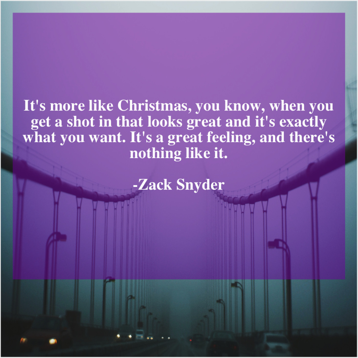 Zack Snyder Zack Snyder – It’s more like Christmas, you… October 19, 2019 admin “It’s more like Christmas, you know, when you get a shot in that looks great and it’s exactly what you want. It’s a great feeling, and there’s nothing like it.”-Zack Snyder