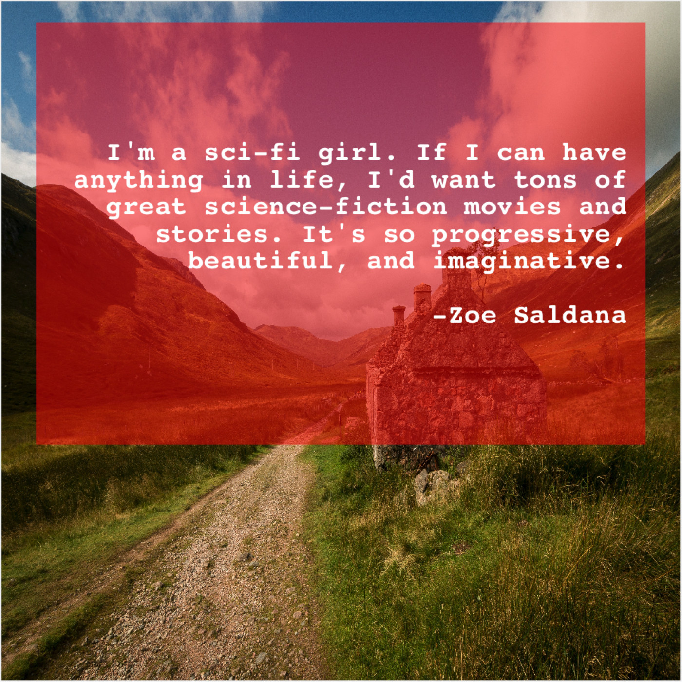 Zoe Saldana Zoe Saldana – I’m a sci-fi girl… September 16, 2019 admin “I’m a sci-fi girl. If I can have anything in life, I’d want tons of great science-fiction movies and stories. It’s so progressive, beautiful, and imaginative.”-Zoe Saldana