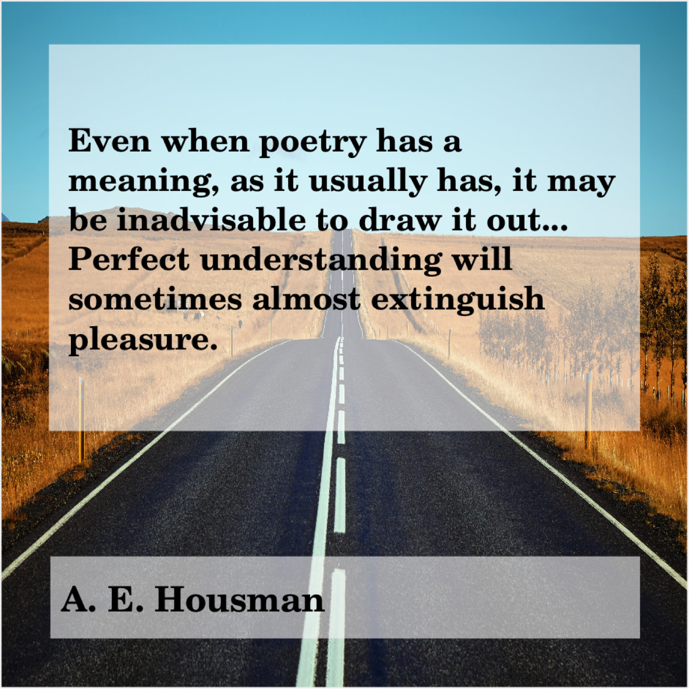 A. E. Housman A. E. Housman – Even when poetry has a… August 1, 2019 admin “Even when poetry has a meaning, as it usually has, it may be inadvisable to draw it out… Perfect understanding will sometimes almost extinguish pleasure.”-A. E. Housman