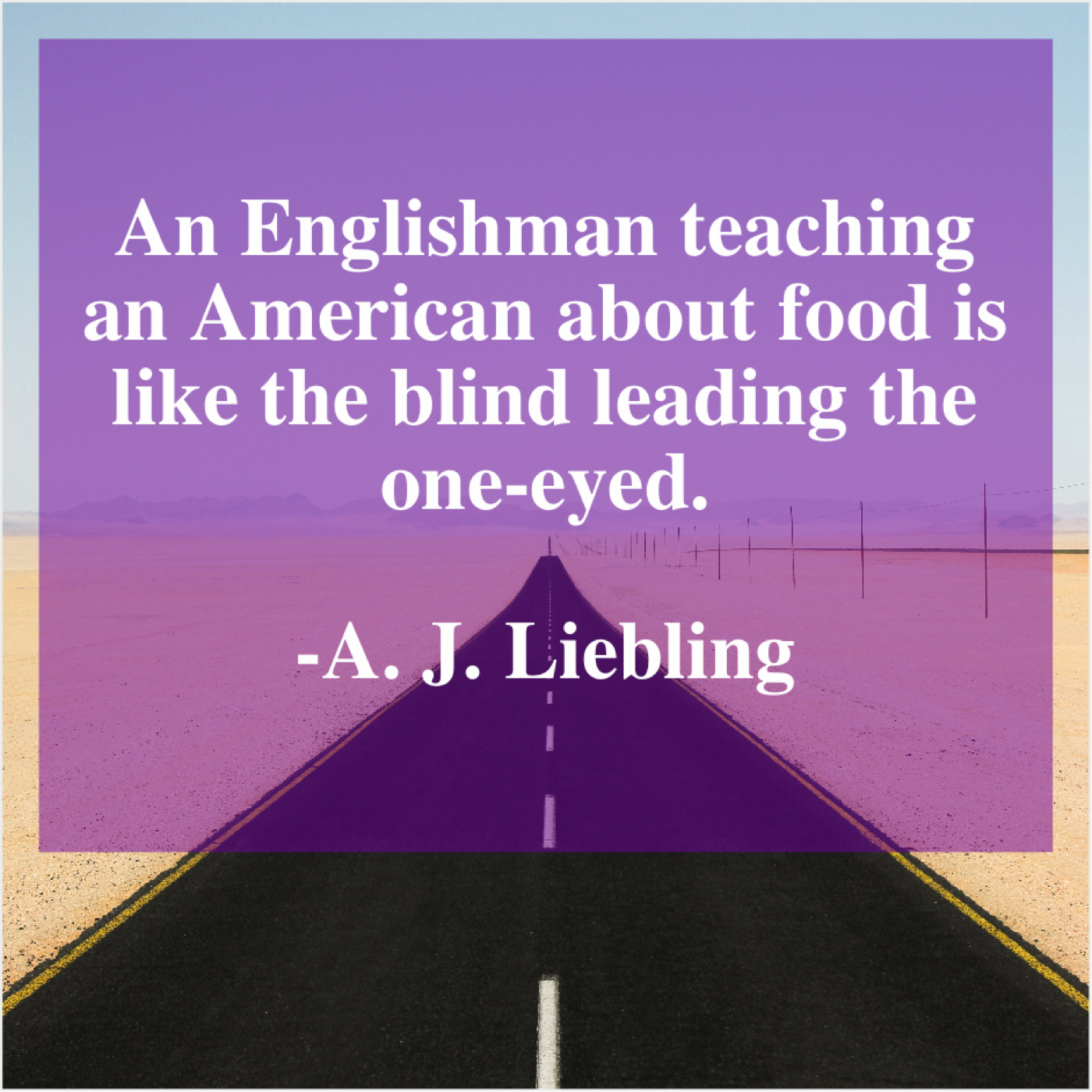 A. J. Liebling A. J. Liebling – An Englishman teaching an American… November 19, 2018 admin “An Englishman teaching an American about food is like the blind leading the one-eyed.”-A. J. Liebling