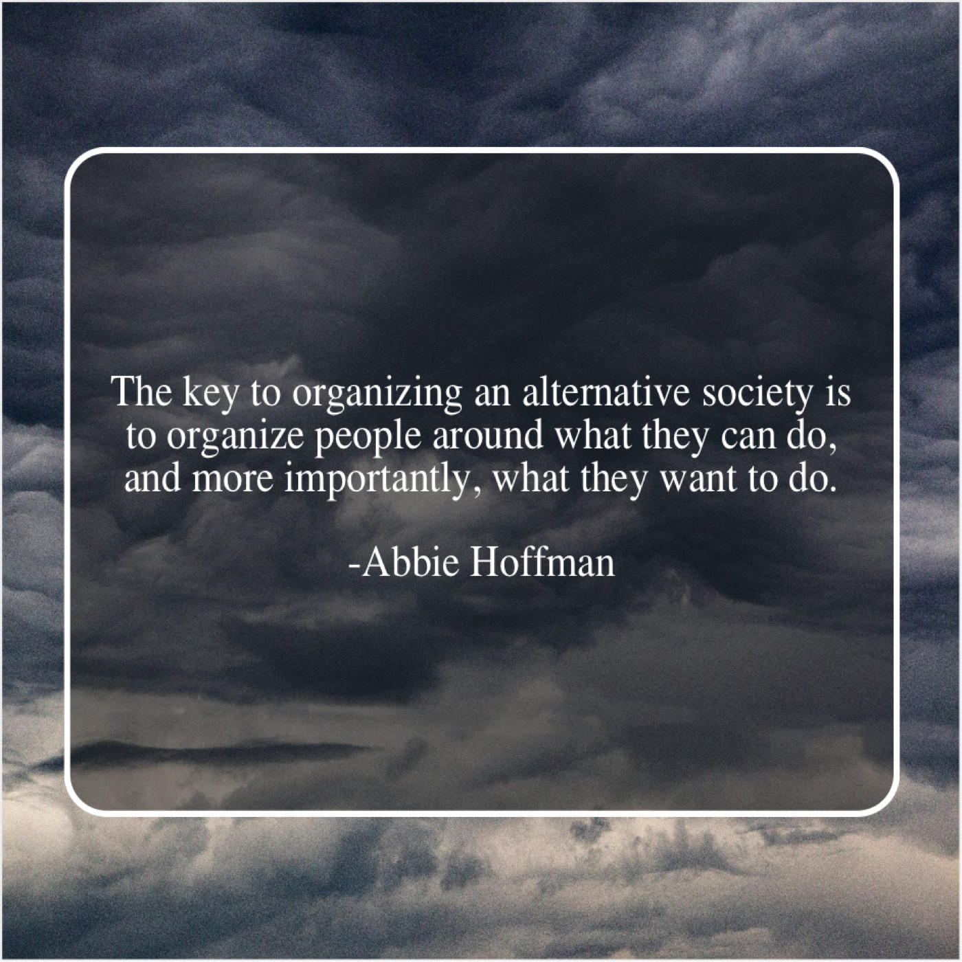 Abbie Hoffman Abbie Hoffman – The key to organizing an… October 30, 2018 admin “The key to organizing an alternative society is to organize people around what they can do, and more importantly, what they want to do.”-Abbie Hoffman