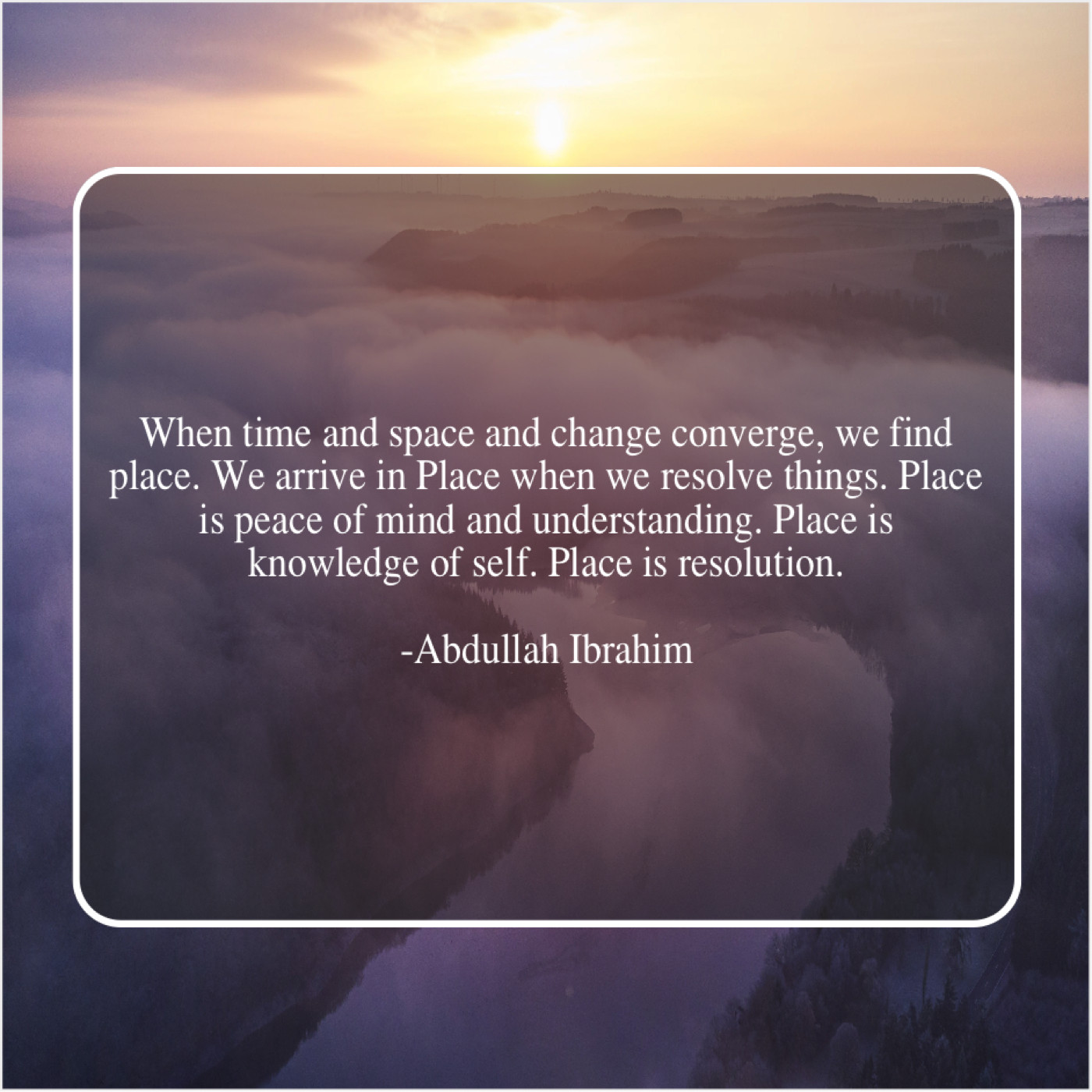 Abdullah Ibrahim Abdullah Ibrahim – When time and space and… August 8, 2019 admin “When time and space and change converge, we find place. We arrive in Place when we resolve things. Place is peace of mind and understanding. Place is knowledge of self. Place is resolution.”-Abdullah Ibrahim