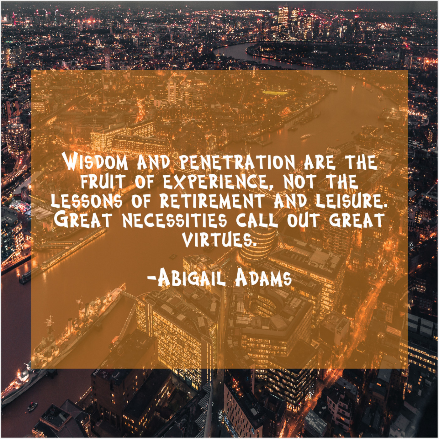 Abigail Adams Abigail Adams – Wisdom and penetration are the… June 21, 2019 admin “Wisdom and penetration are the fruit of experience, not the lessons of retirement and leisure. Great necessities call out great virtues.”-Abigail Adams