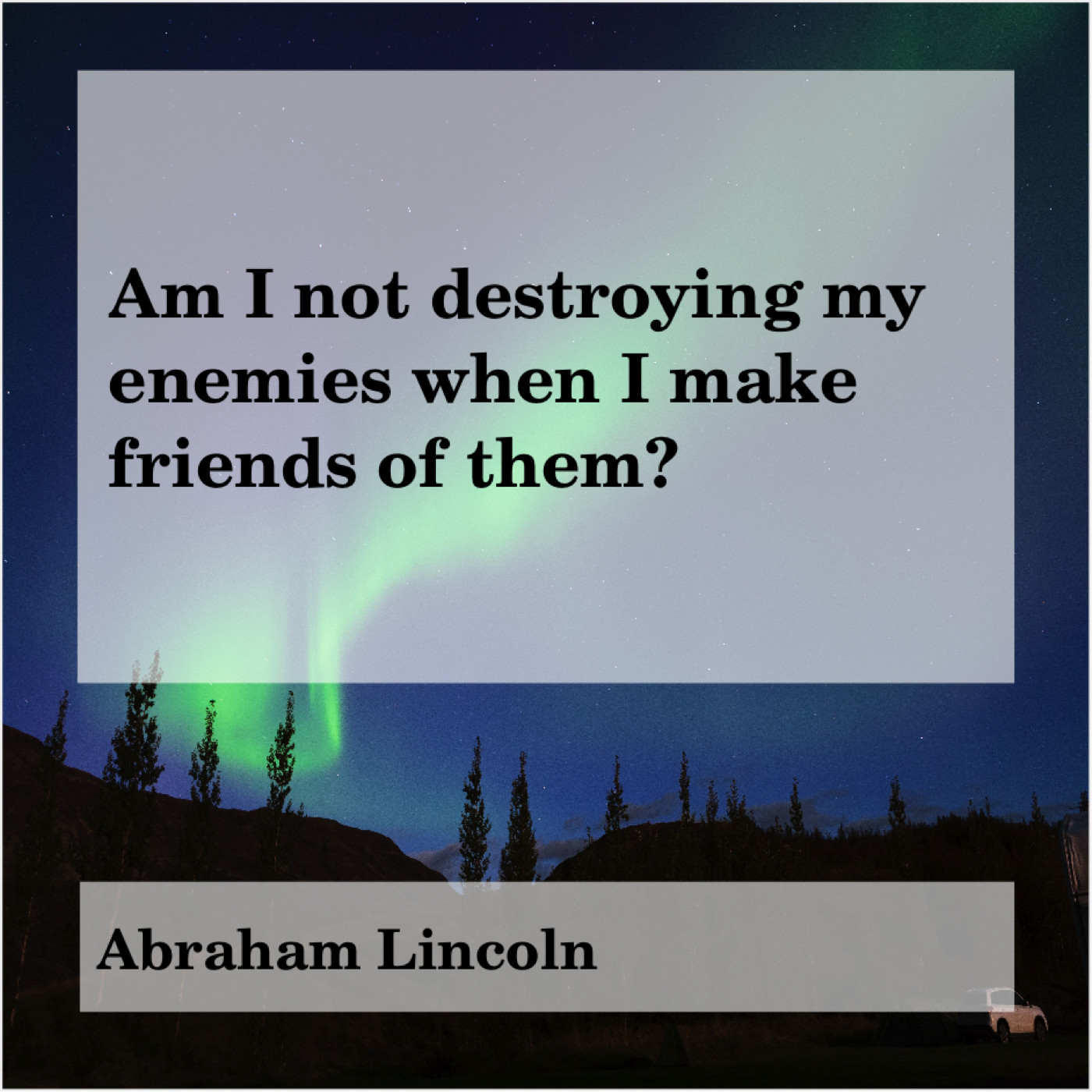 Abraham Lincoln Abraham Lincoln – Am I not destroying my… June 5, 2019 admin “Am I not destroying my enemies when I make friends of them?”-Abraham Lincoln