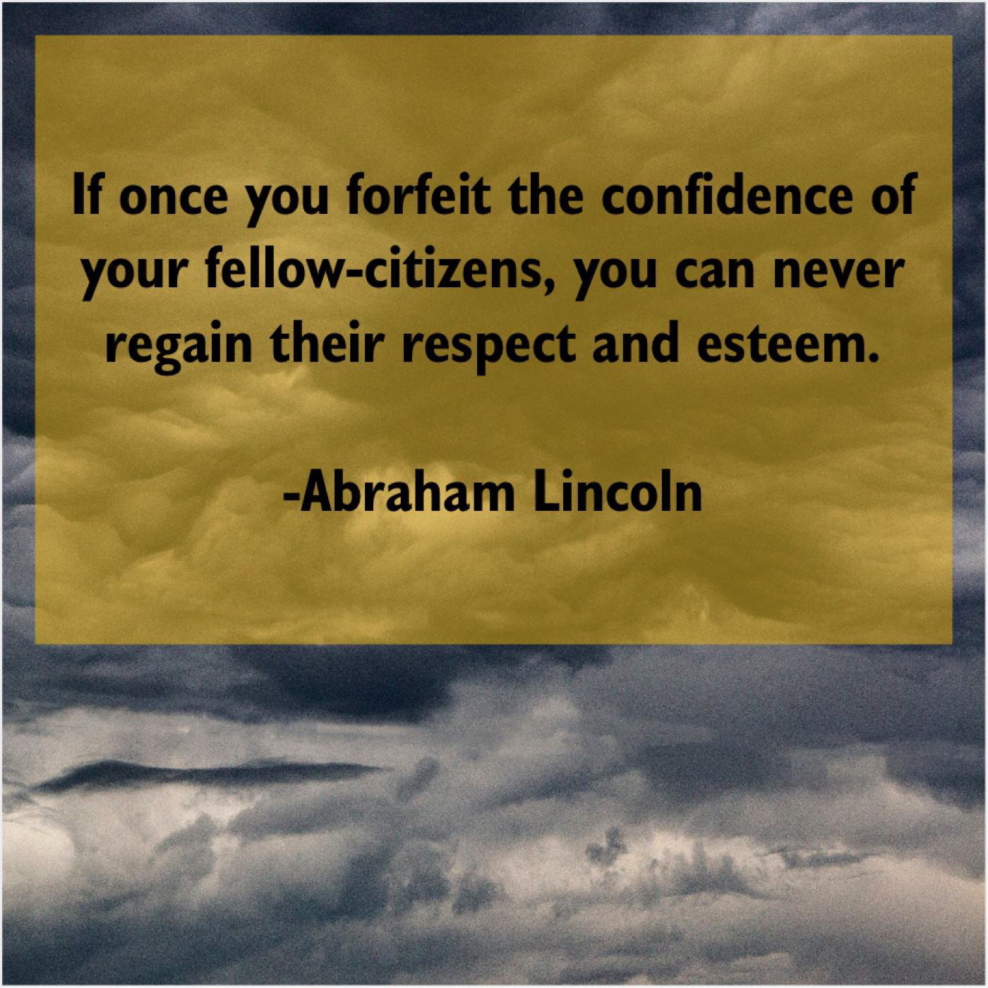 Abraham Lincoln Abraham Lincoln – If once you forfeit the… October 21, 2019 admin “If once you forfeit the confidence of your fellow-citizens, you can never regain their respect and esteem.”-Abraham Lincoln