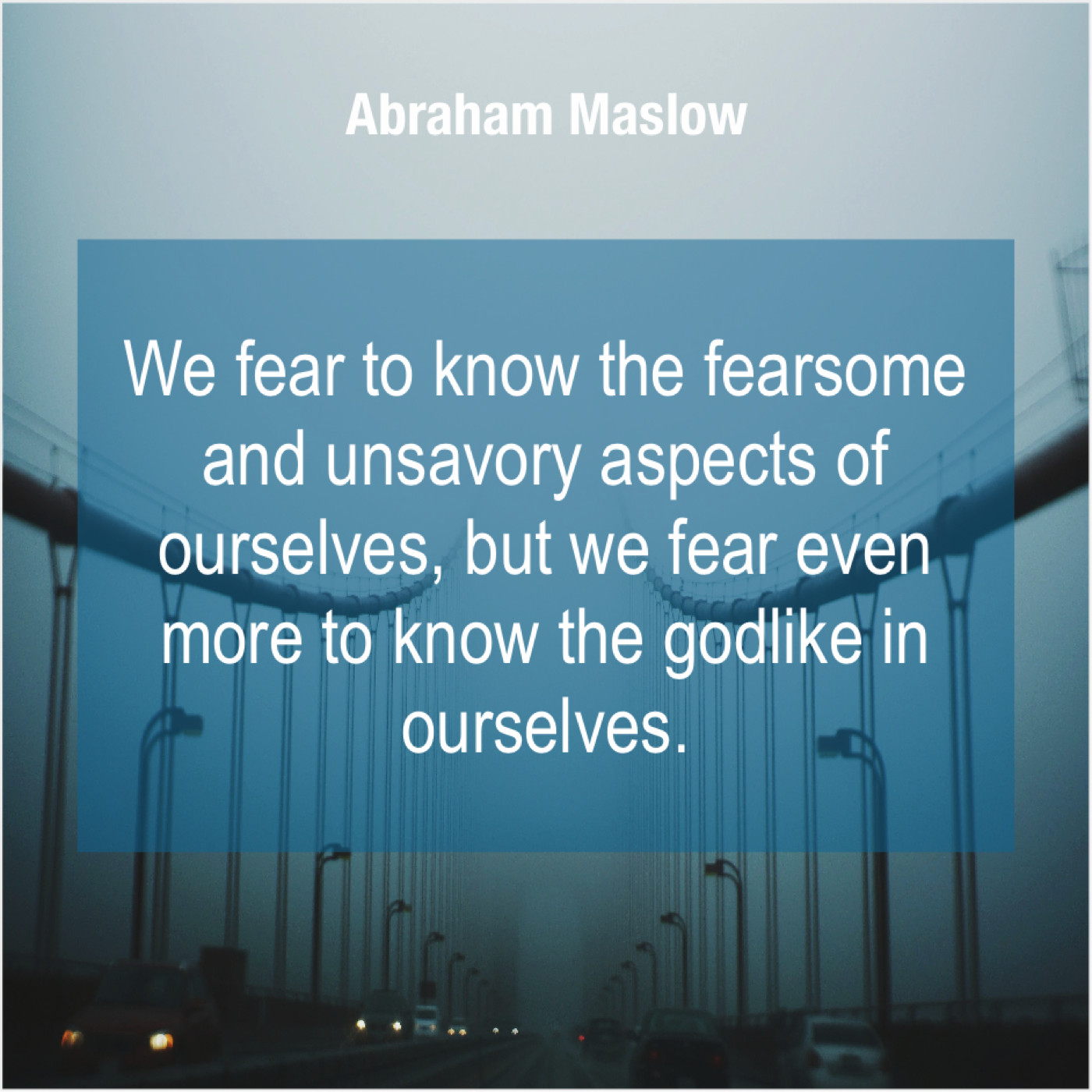 Abraham Maslow Abraham Maslow – We fear to know the… January 29, 2019 admin “We fear to know the fearsome and unsavory aspects of ourselves, but we fear even more to know the godlike in ourselves.”-Abraham Maslow