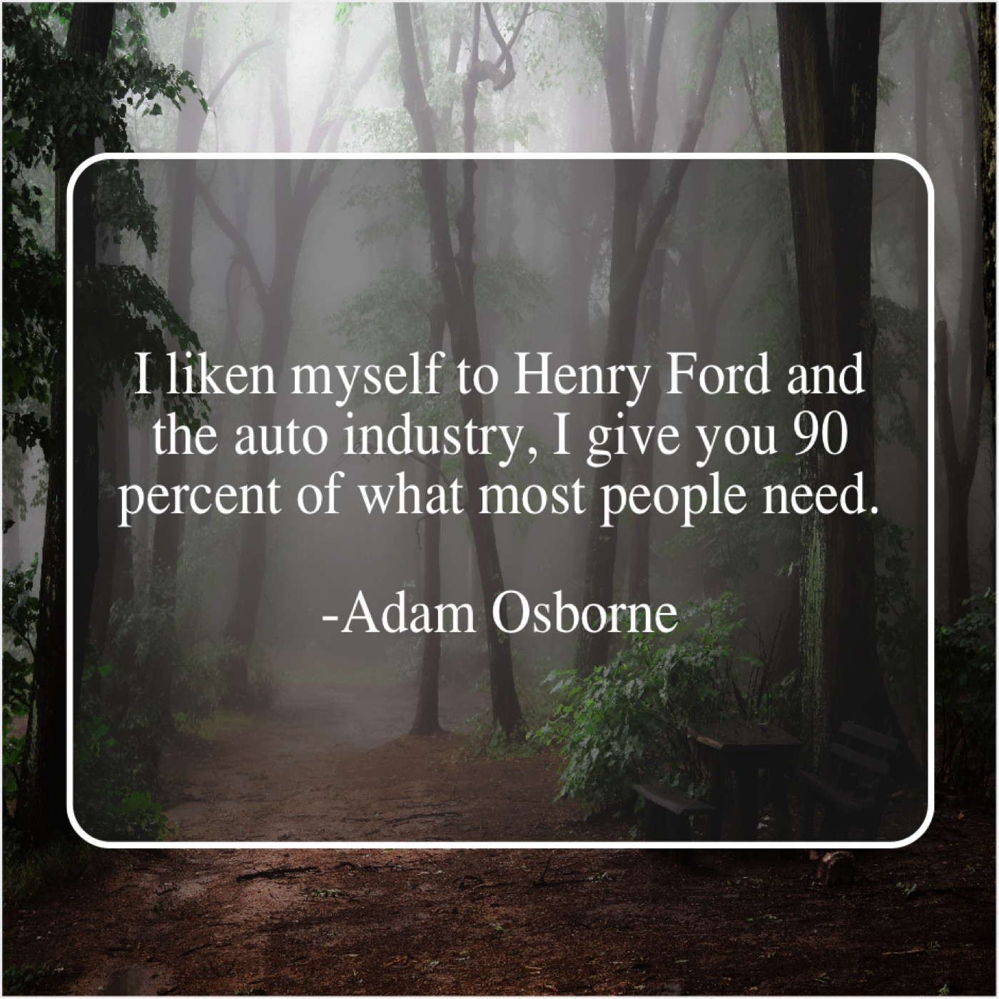 Adam Osborne Adam Osborne – I liken myself to Henry… November 7, 2018 admin “I liken myself to Henry Ford and the auto industry, I give you 90 percent of what most people need.”-Adam Osborne