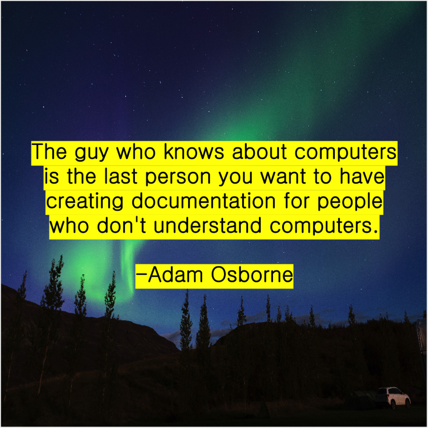 Adam Osborne Adam Osborne – The guy who knows about… April 16, 2019 admin “The guy who knows about computers is the last person you want to have creating documentation for people who don’t understand computers.”-Adam Osborne
