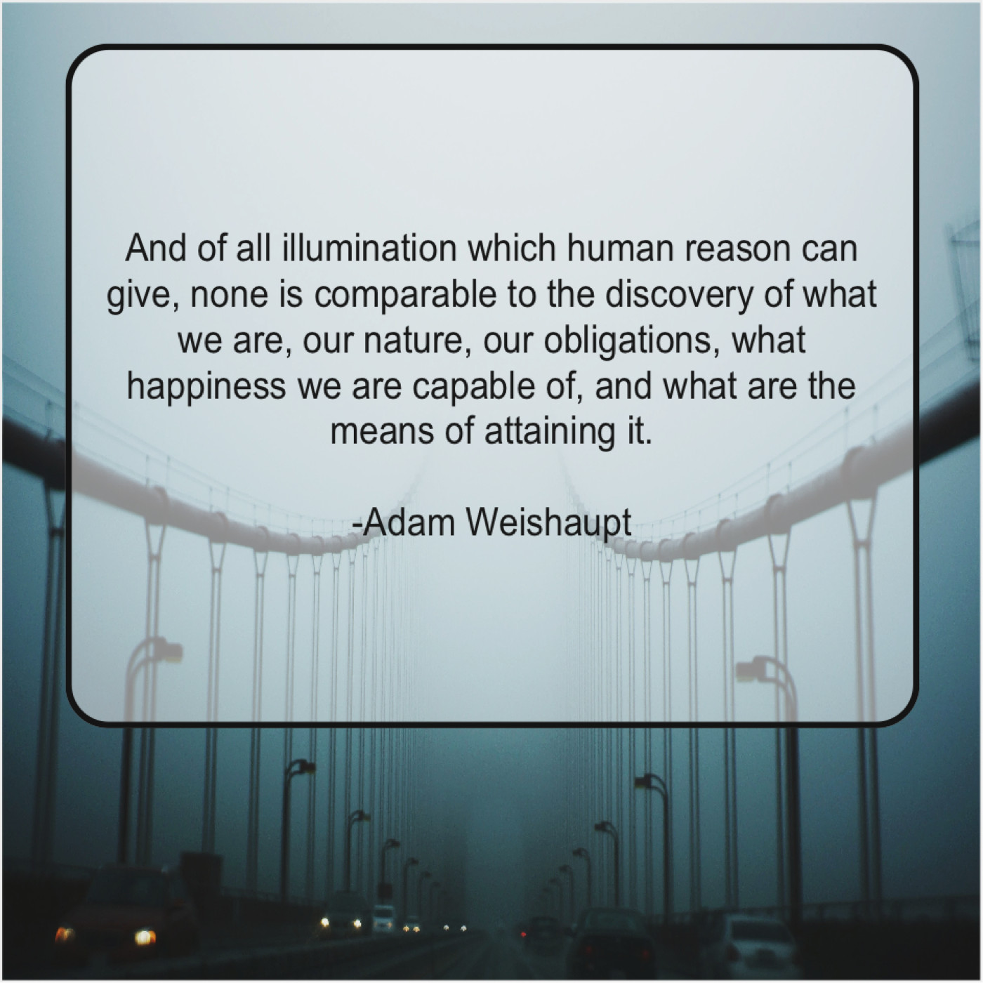 Adam Weishaupt Adam Weishaupt – And of all illumination which… July 5, 2019 admin “And of all illumination which human reason can give, none is comparable to the discovery of what we are, our nature, our obligations, what happiness we are capable of, and what are the means of attaining it.”-Adam Weishaupt