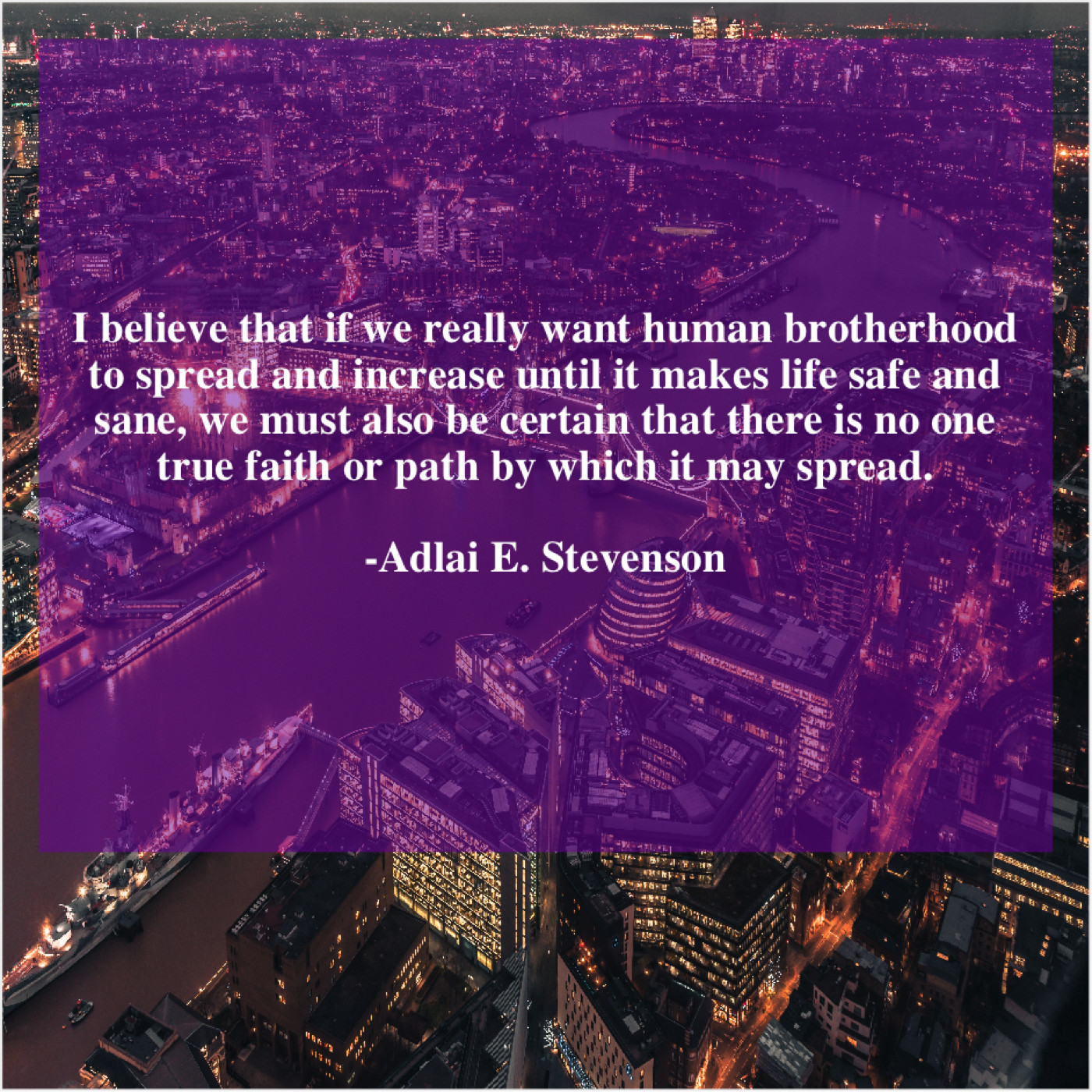 Adlai E. Stevenson Adlai E. Stevenson – I believe that if we… March 5, 2019 admin “I believe that if we really want human brotherhood to spread and increase until it makes life safe and sane, we must also be certain that there is no one true faith or path by which it may spread.”-Adlai E. Stevenson