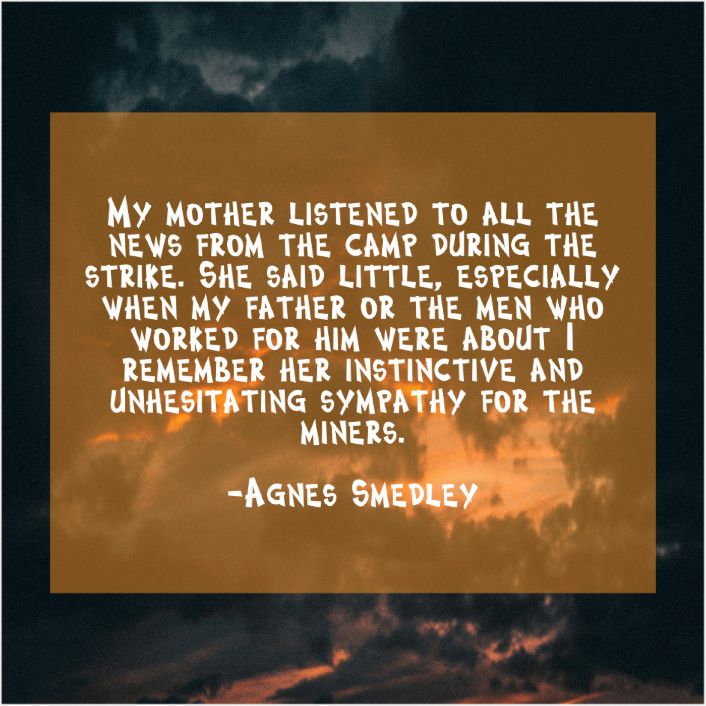 Agnes Smedley Agnes Smedley – My mother listened to all… April 7, 2019 admin “My mother listened to all the news from the camp during the strike. She said little, especially when my father or the men who worked for him were about I remember her instinctive and unhesitating sympathy for the miners.”-Agnes Smedley
