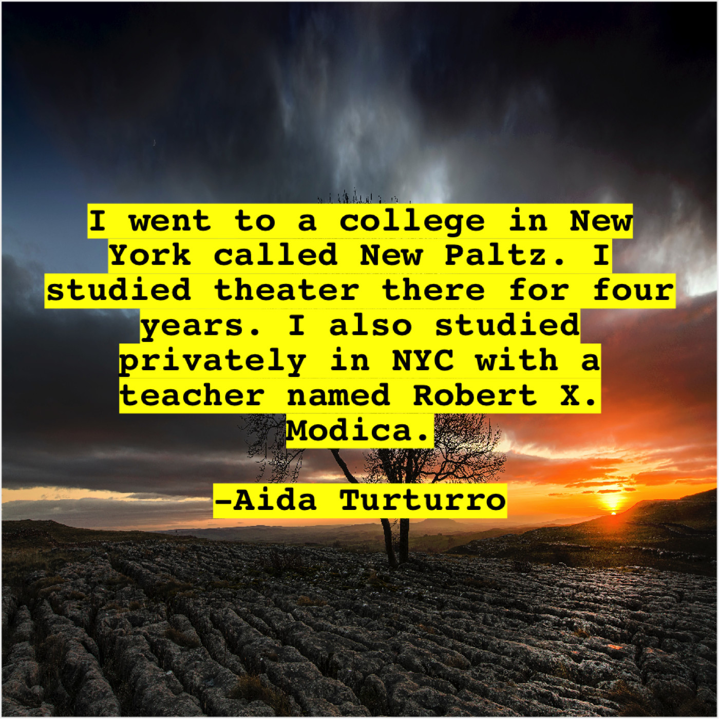 Aida Turturro Aida Turturro – I went to a college… March 14, 2019 admin “I went to a college in New York called New Paltz. I studied theater there for four years. I also studied privately in NYC with a teacher named Robert X. Modica.”-Aida Turturro