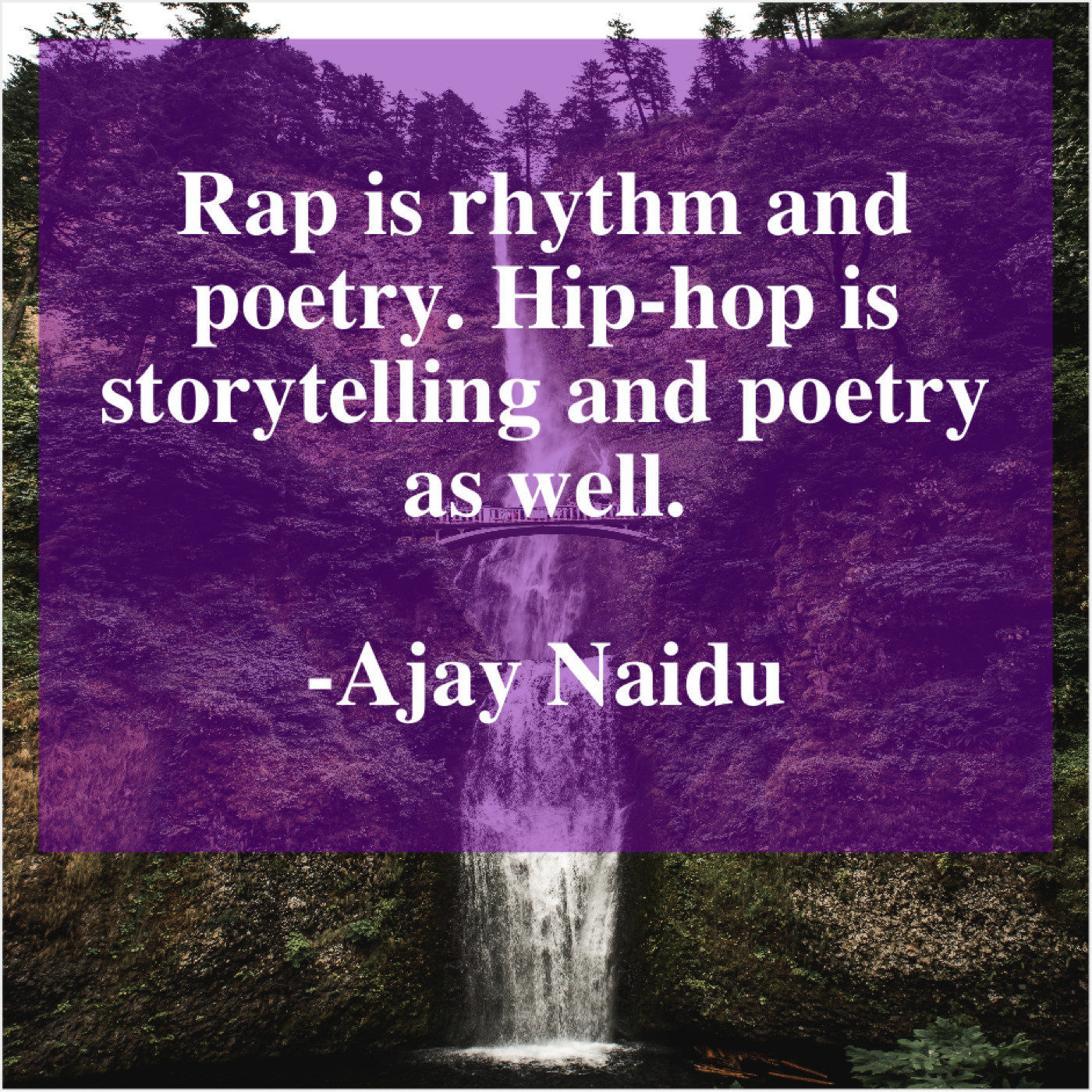 Ajay Naidu Ajay Naidu – Rap is rhythm and poetry… December 16, 2018 admin “Rap is rhythm and poetry. Hip-hop is storytelling and poetry as well.”-Ajay Naidu