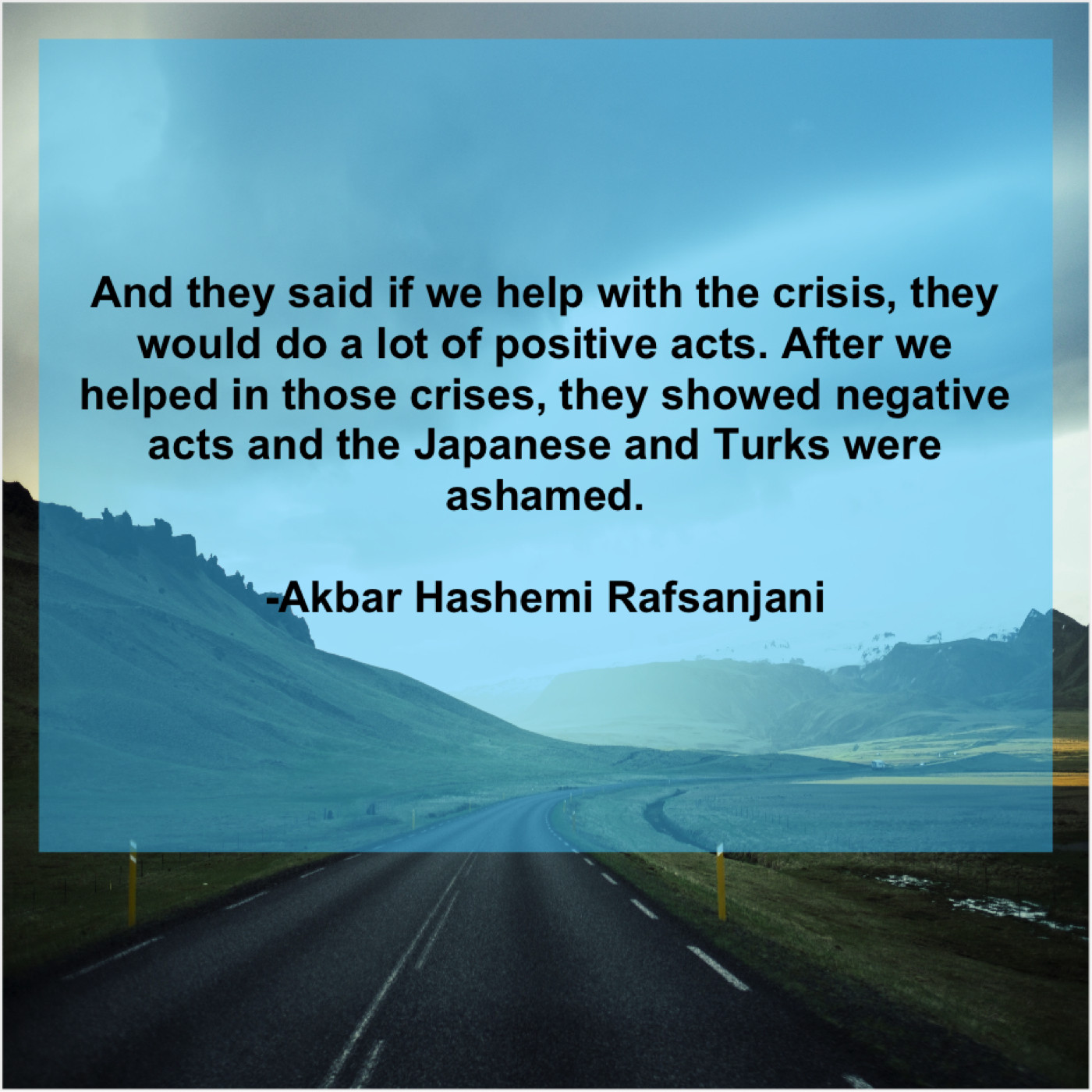 Akbar Hashemi Rafsanjani Akbar Hashemi Rafsanjani – And they said if we… January 23, 2019 admin “And they said if we help with the crisis, they would do a lot of positive acts. After we helped in those crises, they showed negative acts and the Japanese and Turks were ashamed.”-Akbar Hashemi Rafsanjani