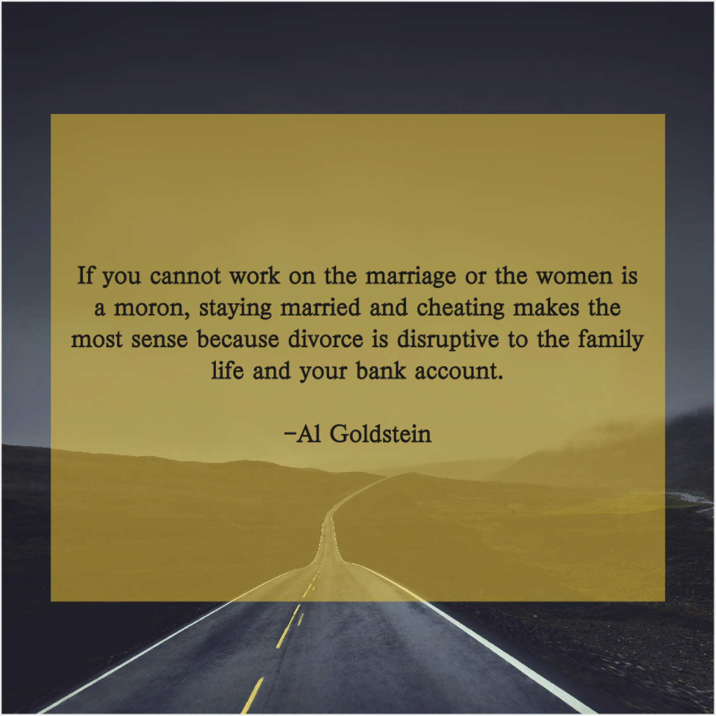 Al Goldstein Al Goldstein – If you cannot work on… January 29, 2019 admin “If you cannot work on the marriage or the women is a moron, staying married and cheating makes the most sense because divorce is disruptive to the family life and your bank account.”-Al Goldstein