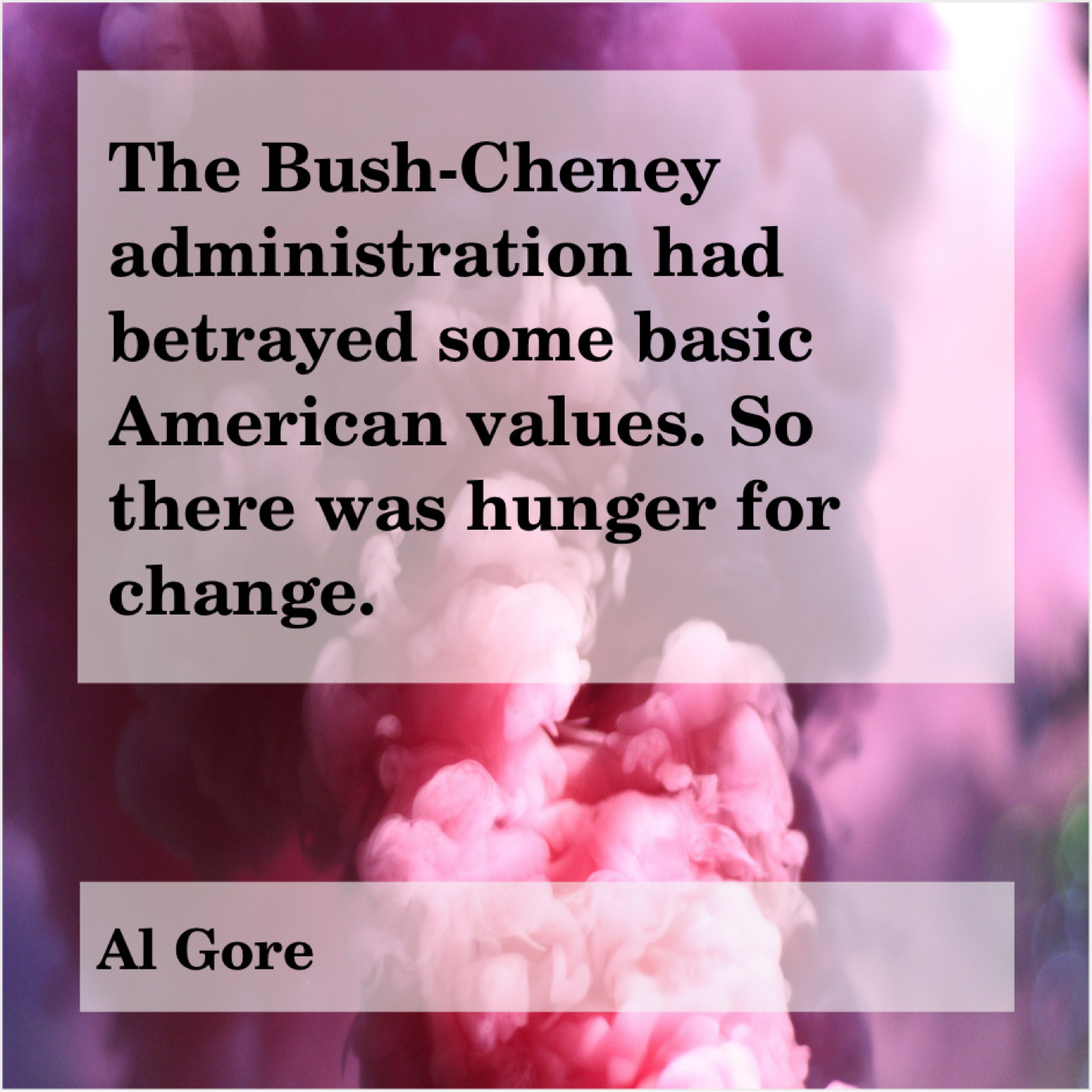 Al Gore Al Gore – The Bush-Cheney administration had… October 15, 2019 admin “The Bush-Cheney administration had betrayed some basic American values. So there was hunger for change.”-Al Gore