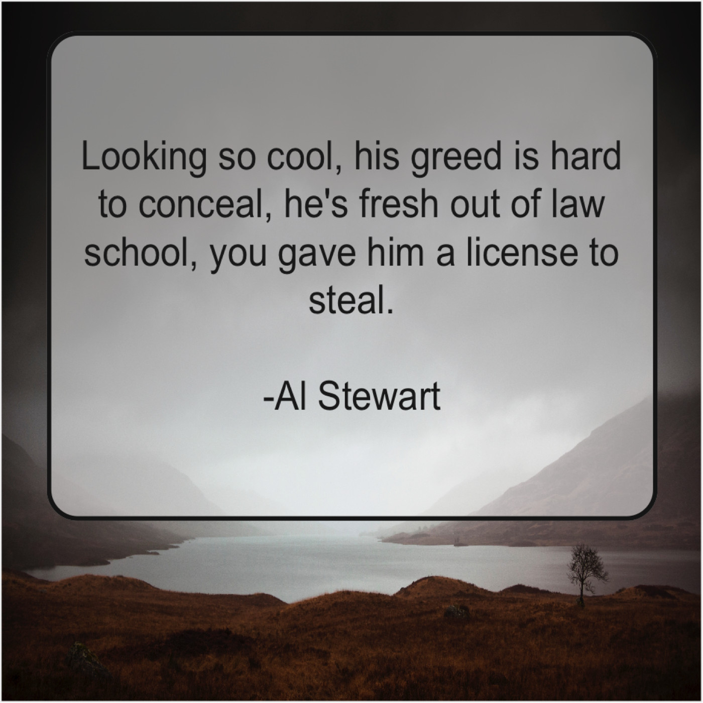Al Stewart Al Stewart – Looking so cool, his greed… October 7, 2019 admin “Looking so cool, his greed is hard to conceal, he’s fresh out of law school, you gave him a license to steal.”-Al Stewart