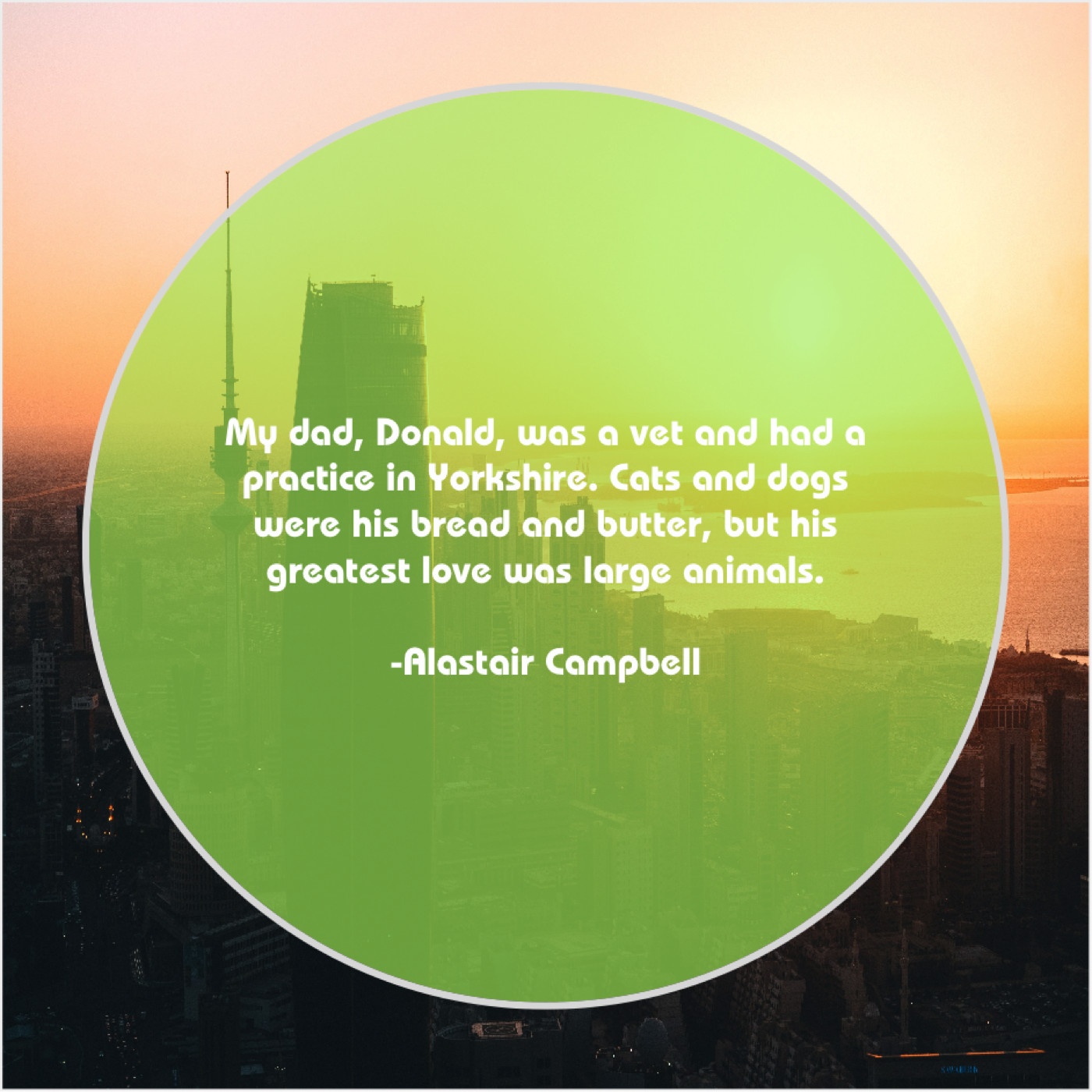 Alastair Campbell Alastair Campbell – My dad, Donald, was a… December 29, 2018 admin “My dad, Donald, was a vet and had a practice in Yorkshire. Cats and dogs were his bread and butter, but his greatest love was large animals.”-Alastair Campbell