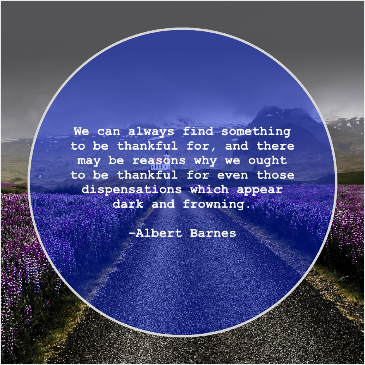 Albert Barnes Albert Barnes – We can always find something… November 13, 2018 admin “We can always find something to be thankful for, and there may be reasons why we ought to be thankful for even those dispensations which appear dark and frowning.”-Albert Barnes