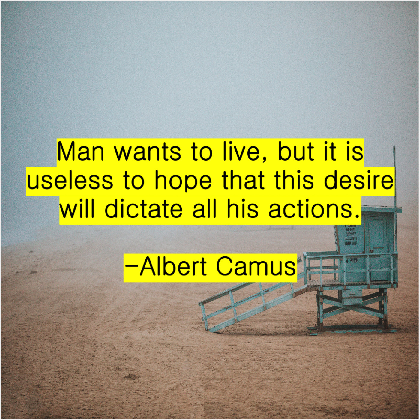 Albert Camus Albert Camus – Man wants to live, but… June 5, 2019 admin “Man wants to live, but it is useless to hope that this desire will dictate all his actions.”-Albert Camus