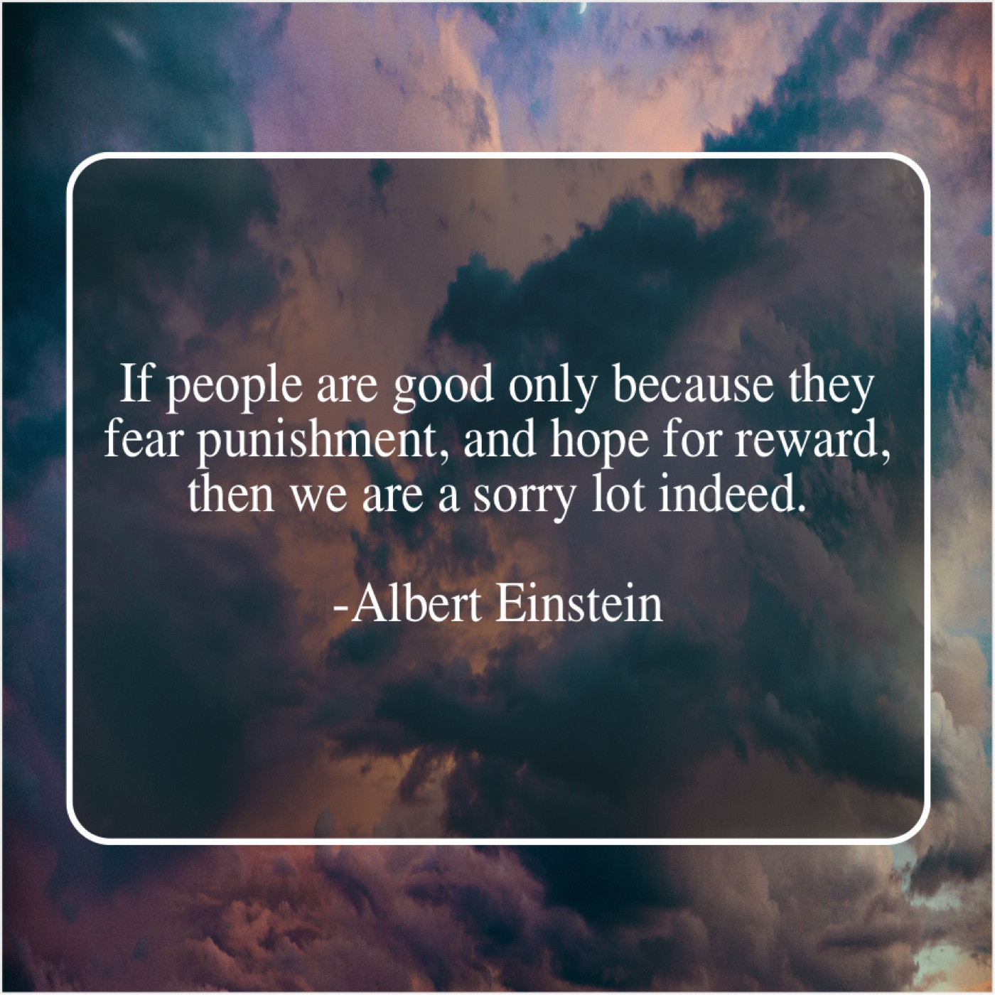 Albert Einstein Albert Einstein – If people are good only… January 25, 2019 admin “If people are good only because they fear punishment, and hope for reward, then we are a sorry lot indeed.”-Albert Einstein