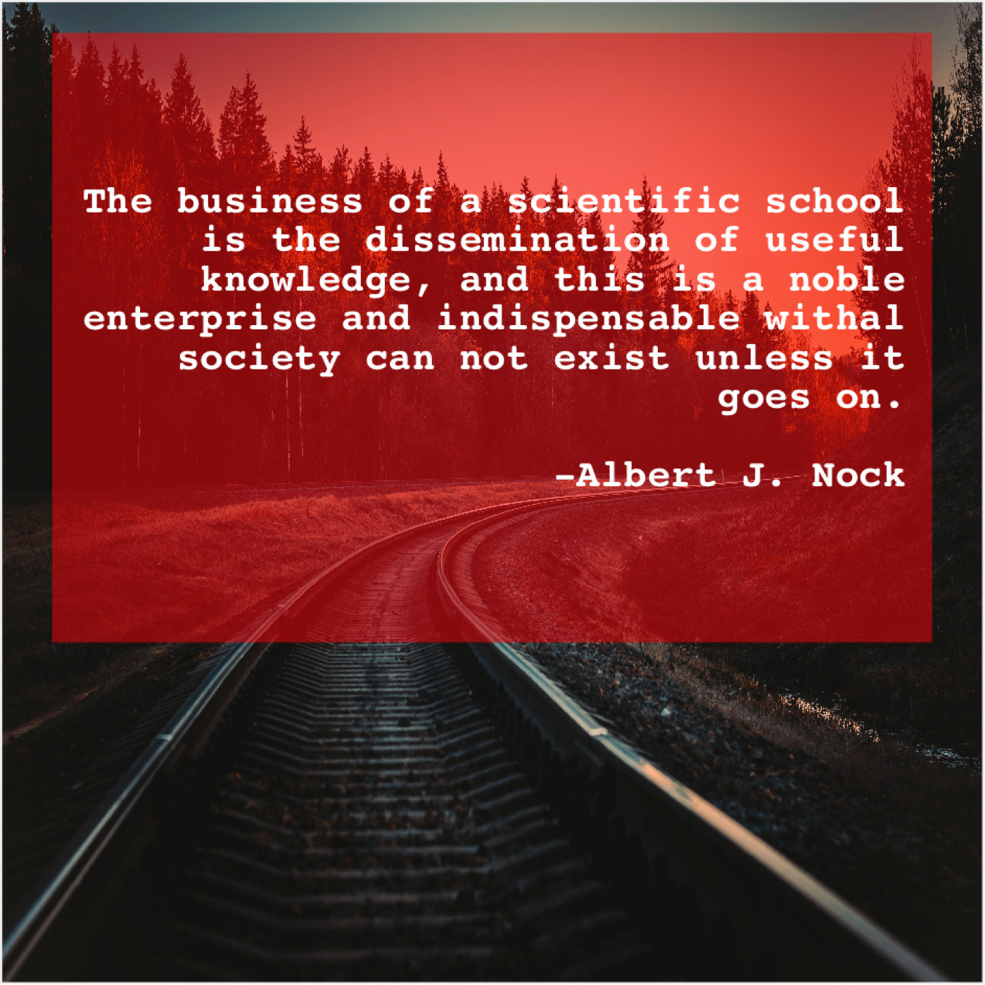 Albert J. Nock Albert J. Nock – The business of a scientific… February 13, 2019 admin “The business of a scientific school is the dissemination of useful knowledge, and this is a noble enterprise and indispensable withal society can not exist unless it goes on.”-Albert J. Nock
