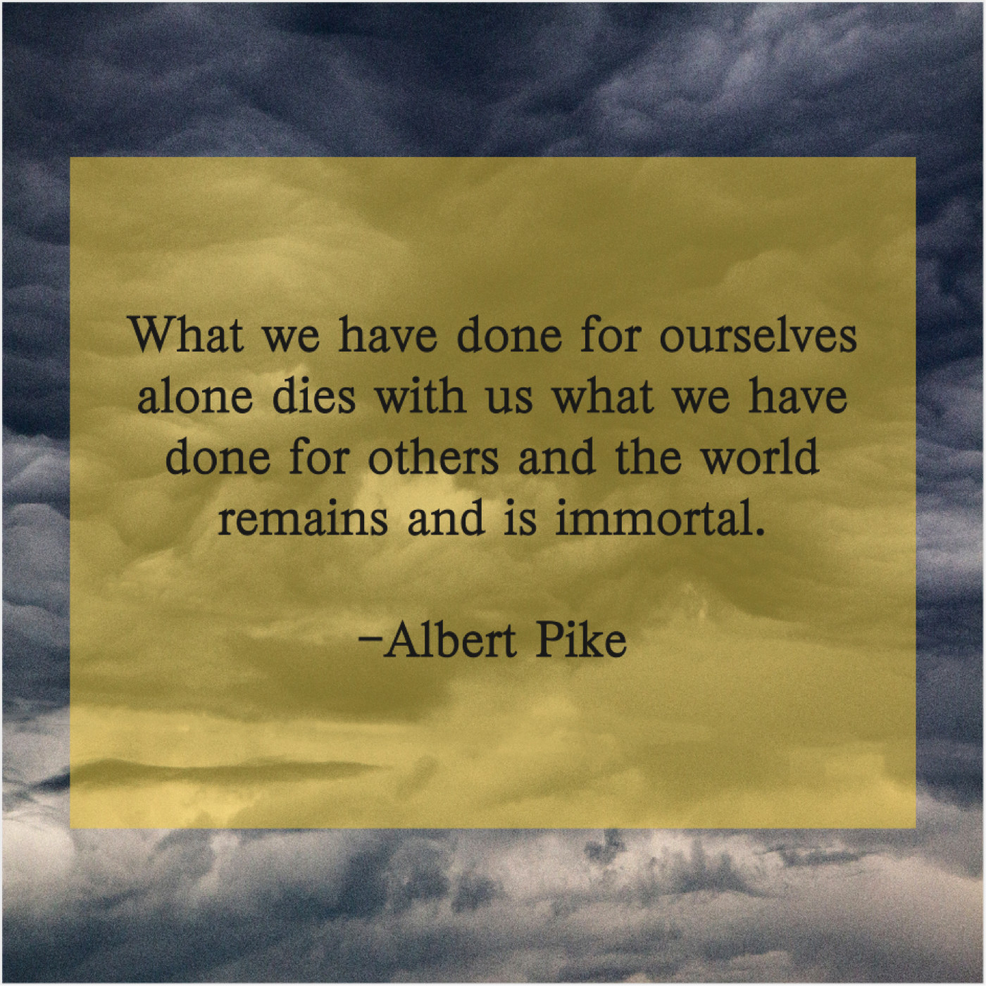 Albert Pike Albert Pike – What we have done for… December 30, 2018 admin “What we have done for ourselves alone dies with us what we have done for others and the world remains and is immortal.”-Albert Pike