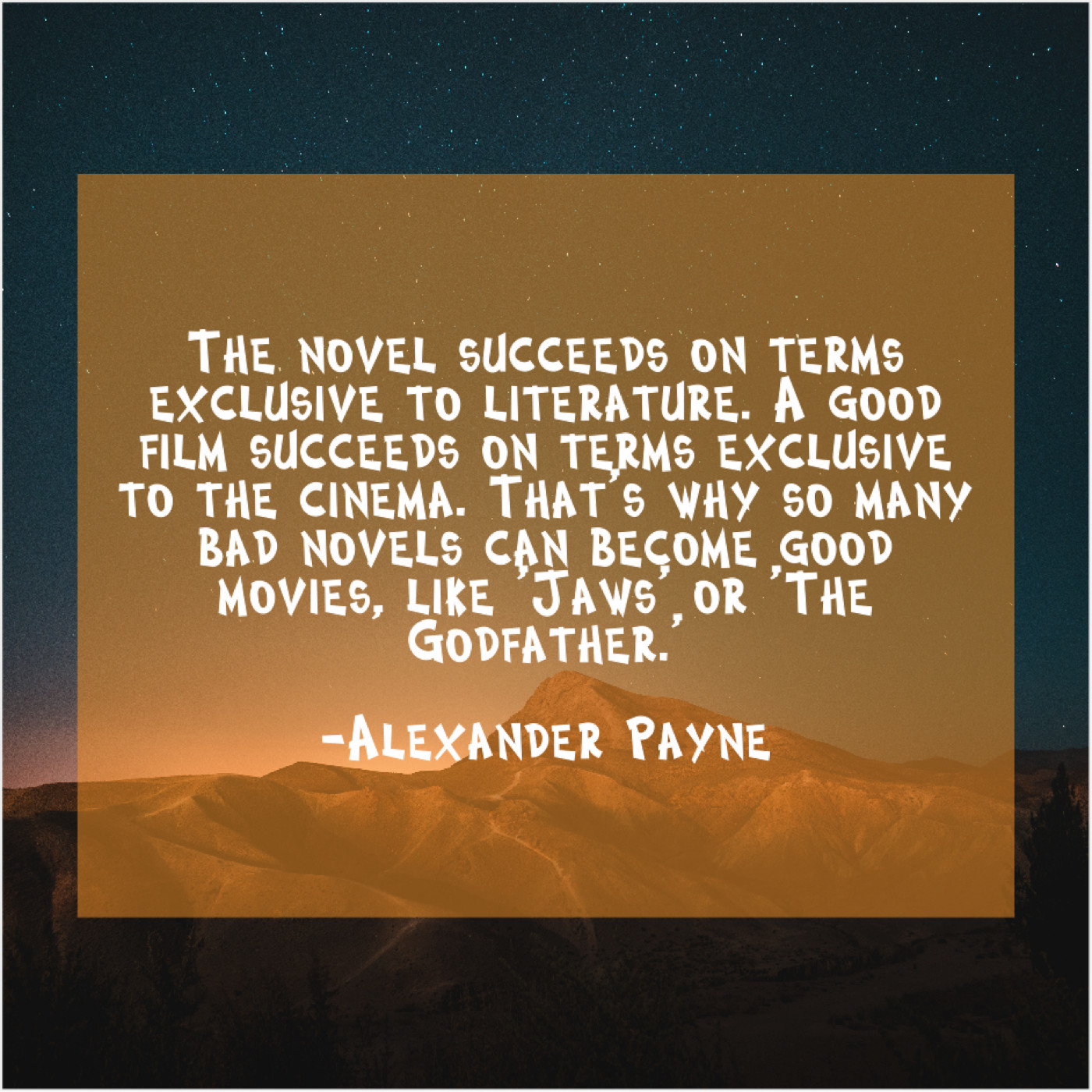 “The novel succeeds on terms exclusive to literature. A good film succeeds on terms exclusive to the cinema. That’s why so many bad novels can become good movies, like ‘Jaws’ or ‘The Godfather.'”
