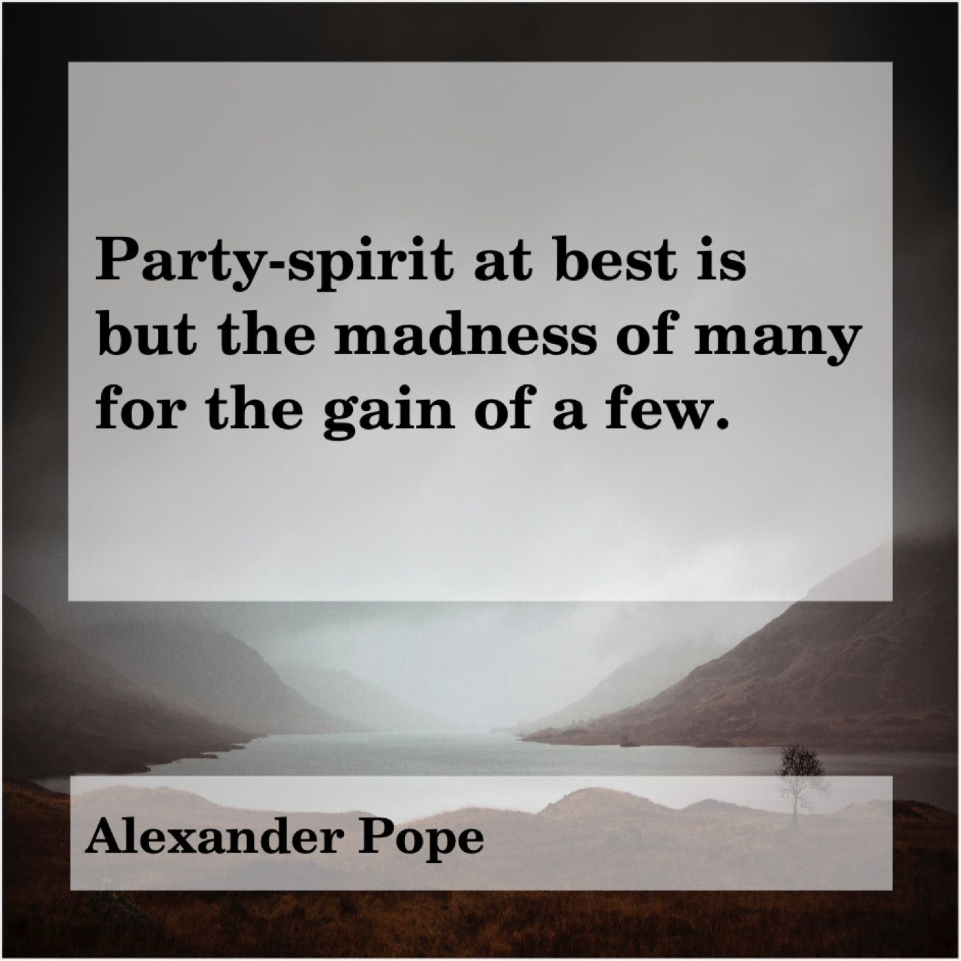Alexander Pope Alexander Pope – Party-spirit at best is… October 30, 2018 admin “Party-spirit at best is but the madness of many for the gain of a few.”-Alexander Pope