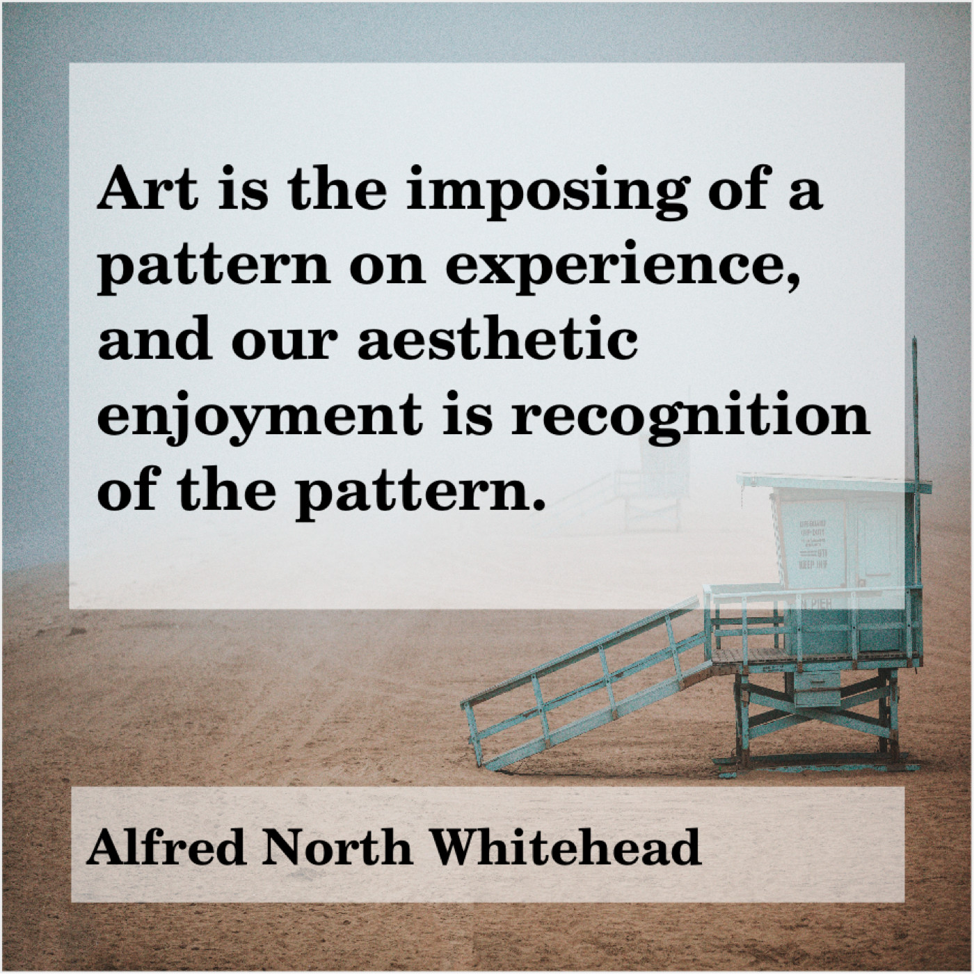 Alfred North Whitehead Alfred North Whitehead – Art is the imposing of… January 31, 2019 admin “Art is the imposing of a pattern on experience, and our aesthetic enjoyment is recognition of the pattern.”-Alfred North Whitehead