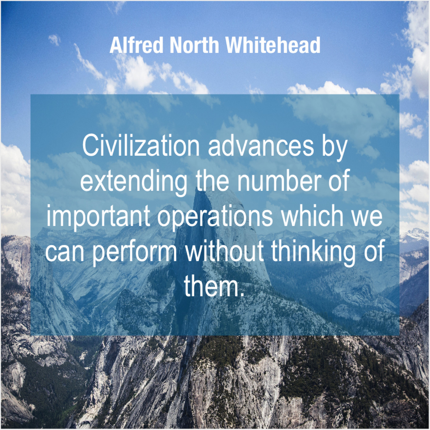 Alfred North Whitehead Alfred North Whitehead – Civilization advances by extending the… February 11, 2019 admin “Civilization advances by extending the number of important operations which we can perform without thinking of them.”-Alfred North Whitehead