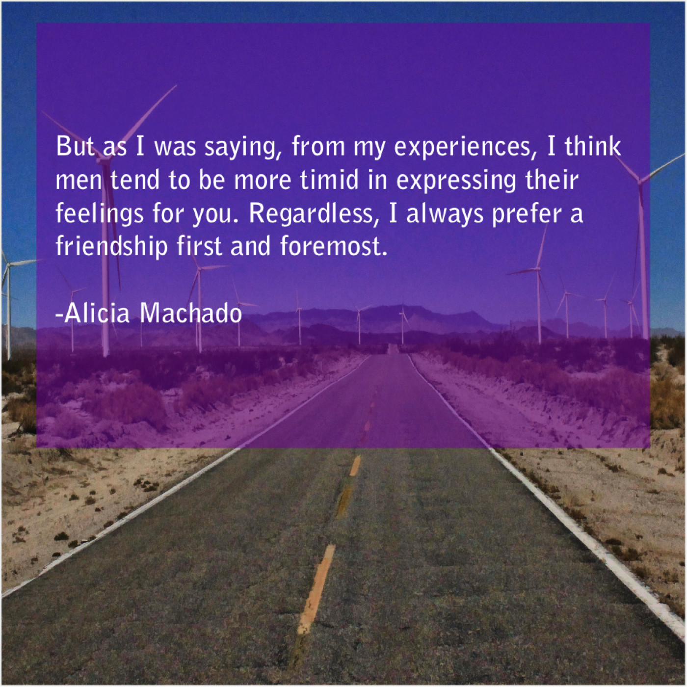 Alicia Machado Alicia Machado – But as I was saying… September 24, 2019 admin “But as I was saying, from my experiences, I think men tend to be more timid in expressing their feelings for you. Regardless, I always prefer a friendship first and foremost.”-Alicia Machado