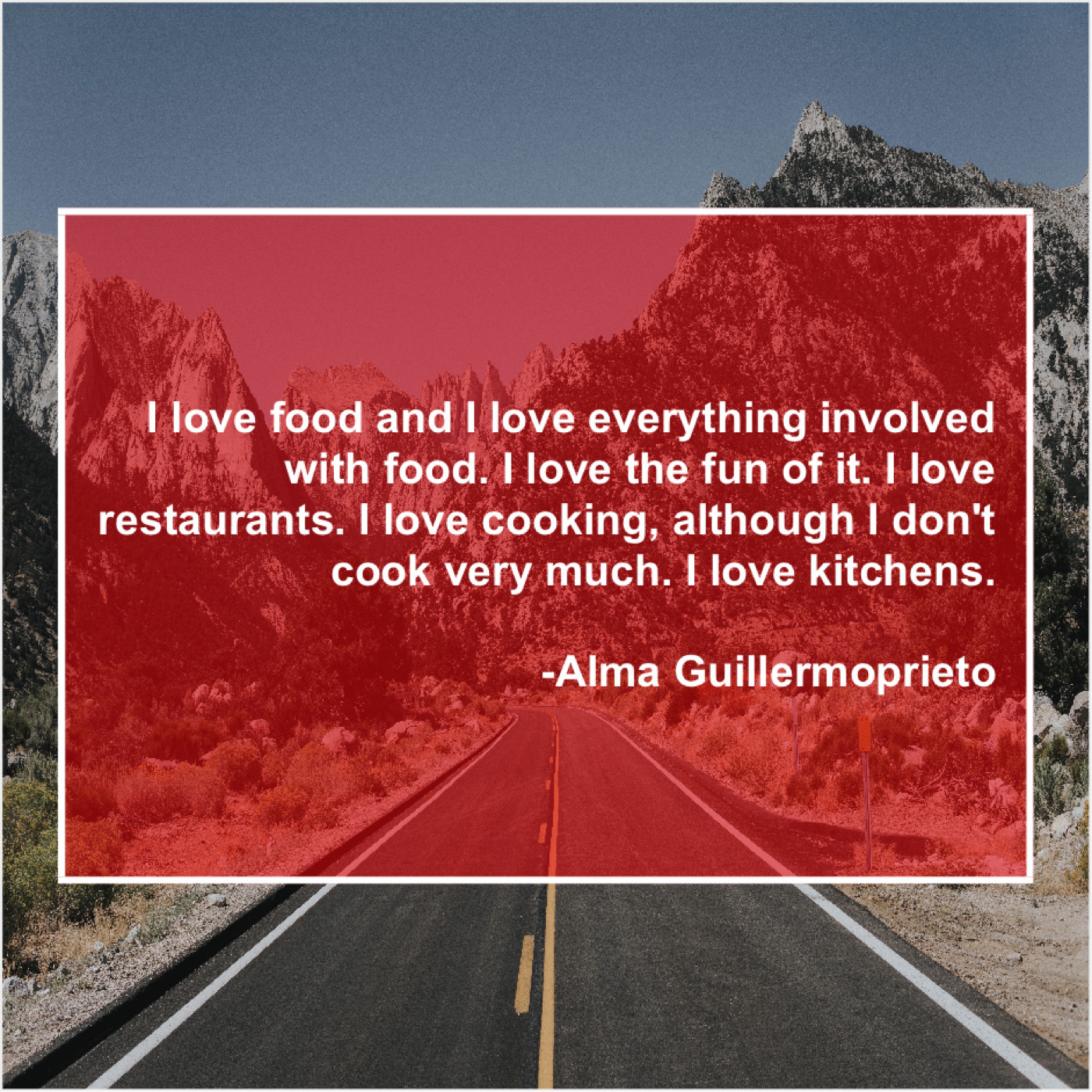 Alma Guillermoprieto Alma Guillermoprieto – I love food and I… May 20, 2019 admin “I love food and I love everything involved with food. I love the fun of it. I love restaurants. I love cooking, although I don’t cook very much. I love kitchens.”-Alma Guillermoprieto